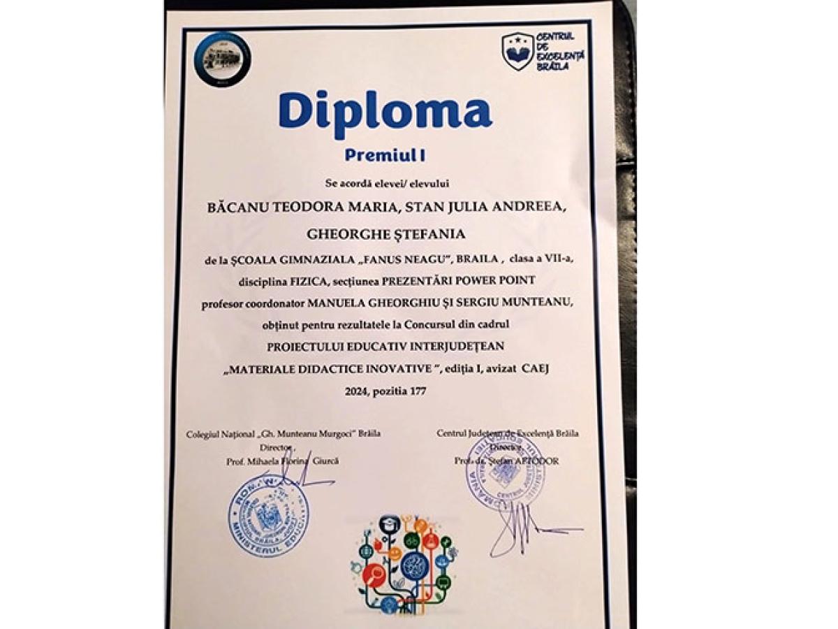 Trei eleve de clasa a VII-a, de la Școala Gimnazială „Fănuș Neagu” Brăila, au obținut recent Premiul I la disciplina Fizică, secțiunea Power Point, la concursul organizat în cadrul proiectului educativ interjudețean „Materiale didactice inovative”, ediția I 2024. Cele trei eleve sunt coordonate de profesorii Manuela Gheorghiu și Sergiu Munteanu, de la Școala „Fănuș Neagu” Brăila, iar concursul a fost organizat de Colegiul Național „Gh. Munteanu Murgoci” și de Centrul de Excelență Brăila.
