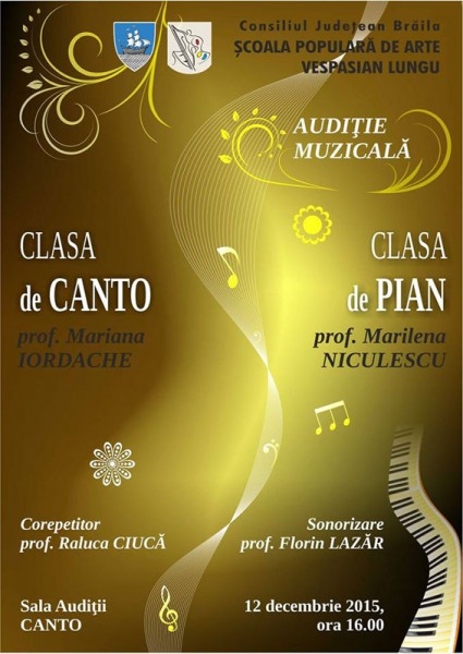 În perioada 11-18 decembrie 2015, la Şcoala Populară de Arte "Vespasian Lungu" vor avea loc o serie de audiţii muzicale la clasele din municipiul Brăila, cât şi la secţiile din judeţ.