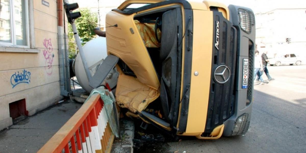 O betonieră s-a răsturnat, ieri după amiază, în jurul orei 15.30, în intersecţia străzii Griviţei cu strada Gral. Eremia Grigorescu (fosta Gării). În cădere, maşina agabaritică a îndoit un stâlp electric şi a avariat pe o porţiune de câţiva metri o balustradă metalică. Cabina s-a îndoit de la jumătate, însă, în chip miraculos, şoferul a scăpat fără nicio zgârietură. Tot datorită unui miracol, niciun pieton nu aştepta la semafor în momentul incidentului. Dacă ar fi fost surprins cineva în zonă, şansele de supravieţuire erau egale cu zero.