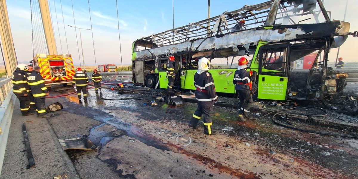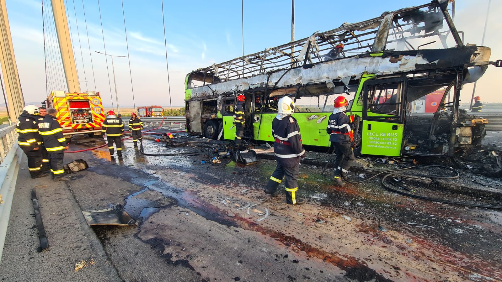 ȘTIRE INIȚIALĂ Un autocar supraetajat a luat foc în mers, în timp ce circula pe podul peste Dunăre, dinspre Tulcea spre Brăila. E posibil ca focul să fi pornit din cauza unui scurtcircuit, dar cauza încă nu a fost stabilită oficial. Au intervenit pentru stingere o autospecială din dotarea ISU Brăila și una din dotarea ISU Tulcea. La bord se aflau 55 de persoane - 53 pasageri și doi șoferi - cetățeni ucraineni. Toți s-au autoevacuat și nu au fost victime.