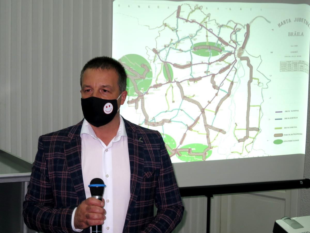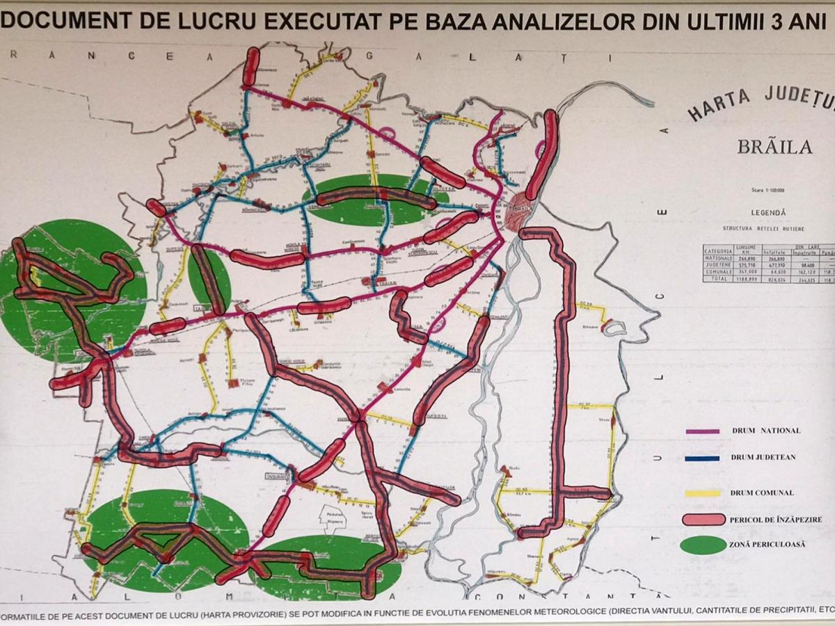 ”Această hartă reprezintă o analiză făcută în urma evenimentelor cu care ne-am confruntat în ultimii ani şi sunt prezentate zonele cu pericol de înzăpezire preponderent pe raza judeţului Brăila. Avem partea de Vest a Judeţului, cu localităţile Jirlău, Galbenu etc. Partea de Sud, în jurul localităţii Bărăganul, atât înspre Vest, cât şi înspre Estul localităţii. Ca drum judeţean avem Șuţeşti - Ianca. ştim că de regulă acesta este primul care se înzăpezeşte în judeţul Brăila. Și partea de la Mărtăceşti până la Gemenele, care iarăşi este o zonă vulnerabilă şi predispusă. Pe drumurile naţionale avem şi aici câteva sectoare de drum care au pus probleme de-a lungul anilor, dar de fiecare dată noi spunem că am făcut faţă, cu sprijinul utilajelor şi cu implicarea tuturor”, a explicat comandantul ISU, col. Ion Cristian, de asemenea prezent la Colegiul Prefectural.