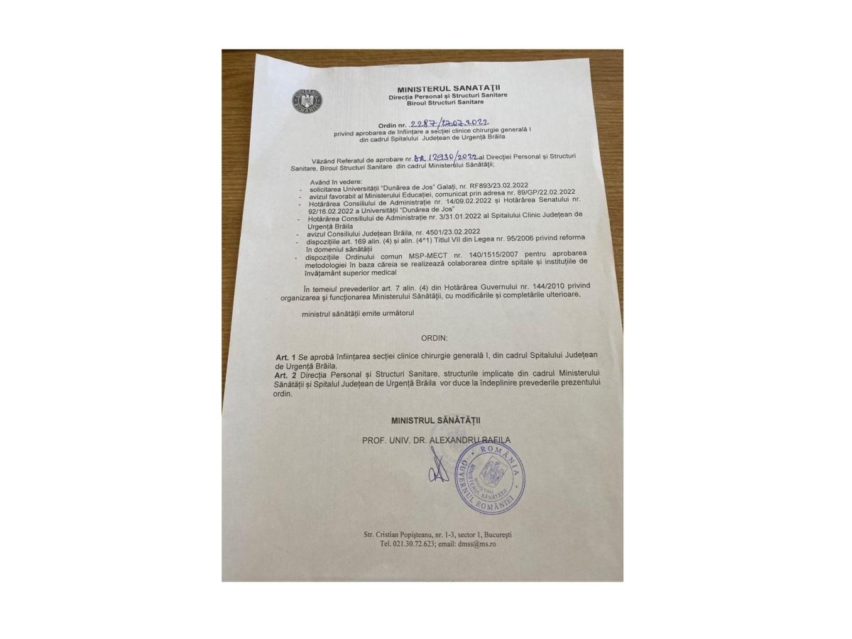 Potrivit Ordinului nr. 2287, semnat de Ministrul Sănătății, dr. Alexandru Rafila, miercuri, 27 iulie a.c. (de sărbătoarea Sf. Mare Mucenic Pantelimon) privind înființarea Secției Clinice Chirurgie Generală I la Spitalul Județean de Urgență Brăila, pentru emiterea deciziei, s-au avut în vedere, printre altele: solicitarea Universității "Dunărea de Jos" Galați, avizul Ministerului Educației, Hotărârea CA și a Senatului Univ. "Dunărea de Jos" (toate emise încă din luna februarie a.c.), Hotărârea CA al Spitalului Clinic Jud. de Urgență Brăila, avizul Consiliului Județean Brăila, dispozițiile Legii nr. 95/2006 privind reforma în domeniul Sănătății și dispozițiile Ordinului comun al MSP - MECT din 2007 privind colaborarea dintre spitale și instituțiile de învățământ superior medical.