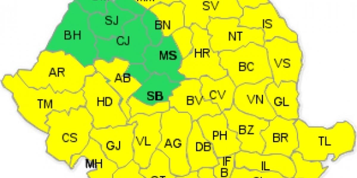 Începând de duminică dimineaţă, codul galben va cuprinde aproape întreaga ţară, cu excepţia judeţelor Satu Mare, Bihor, Sălaj şi Cluj, fiind anunţate precipitaţii până luni, la ora 18.00. Cantităţile de apă vor depăşi 25 de litri pe metru pătrat şi izolat 50 de litri pe metru pătrat, mai ales în jumătatea sudică şi în zonele de munte.