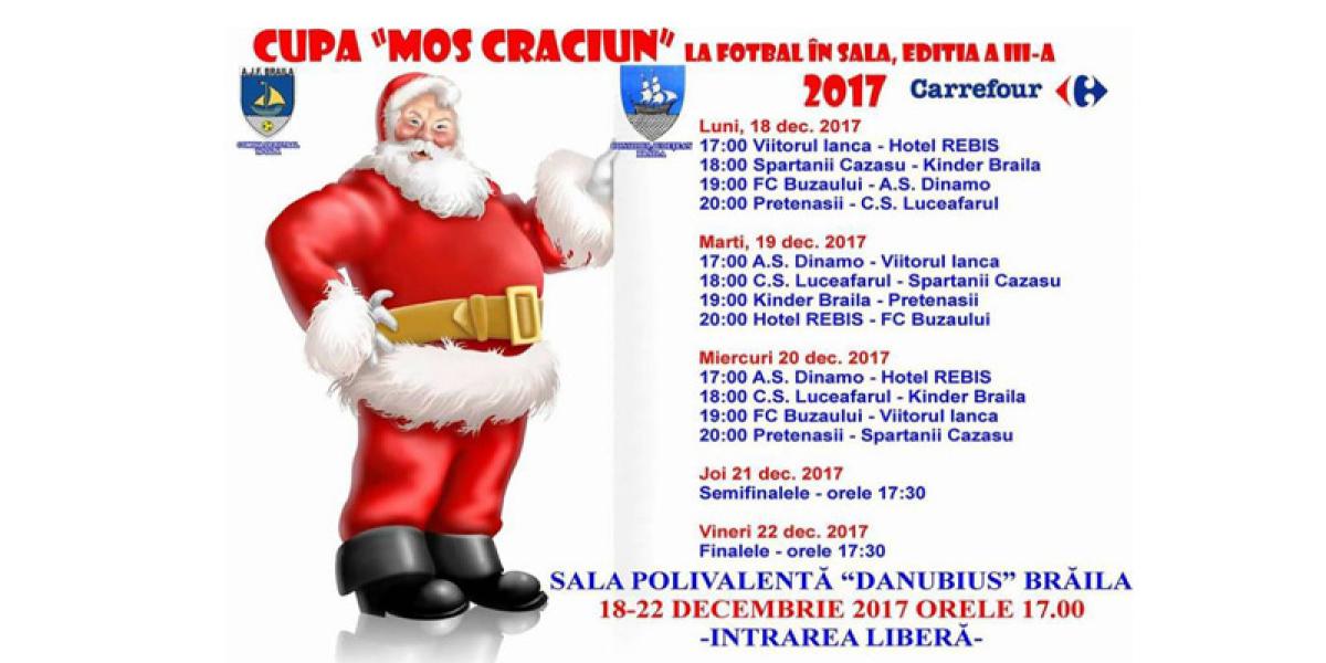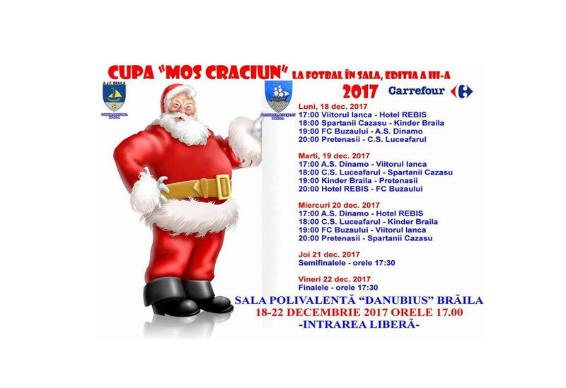 Nume cunoscute din fotbalul pe teren normal, Vasilică Gheorghe şi Liviu Gheorghe fotbalişti care evoluează în prima Ligă, Bănel Nicoliţă care va veni din Cipru pentru acest turneu, componenţi ai lotului naţional de minifotbal Chirică, Bobe şi Dănuţ Ion, alţi jucători care evoluează la echipele divizionare din ţară vin la ediţia a 3-a a Cupei “Moş Crăciun” la minifotbal, competiţie care va debuta astăzi, în Sala Polivalentă. Este pentru prima dată când acest turneu se desfăşoară în Polivalentă, iar organizatorii, Asociaţia Judeţeană de Fotbal Brăila şi Comisia de Fotbal în Sală, au invitat nume sonore din fotbalul nostru, majoritatea brăileni.
