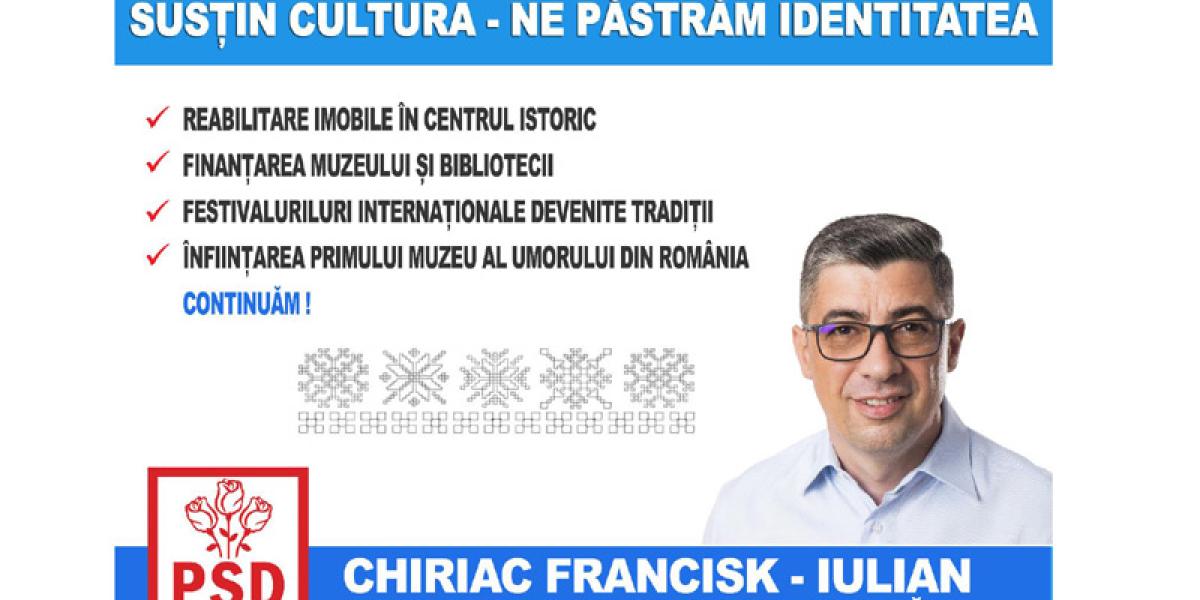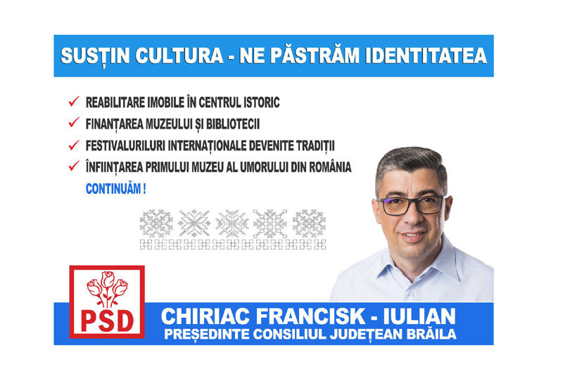 Candidatul PSD Brăila pentru conducerea Consiliului Judeţean, Francisk Chiriac, s-a înscris în “Bătălia pe proiecte” cu un ultim punct - susţinerea activităţilor culturale. Şi acest proiect face parte din planul general al PSD-istului pentru judeţ, intitulat “Pentru Brăila tuturor”. Chiriac a subliniat că are de gând să continue sprijinirea evenimentelor culturale care s-au desfăşurat şi în ultimii patru ani de mandat, a prezentat sumele alocate pentru susţinerea unor asociaţii culturale în această perioadă, adăugând şi un bilanţ al spectacolelor organizate cu ajutorul CJ. Totodată, social-democratul a vorbit şi despre câteva noutăţi pregătite în cazul în care va obţine un nou mandat.