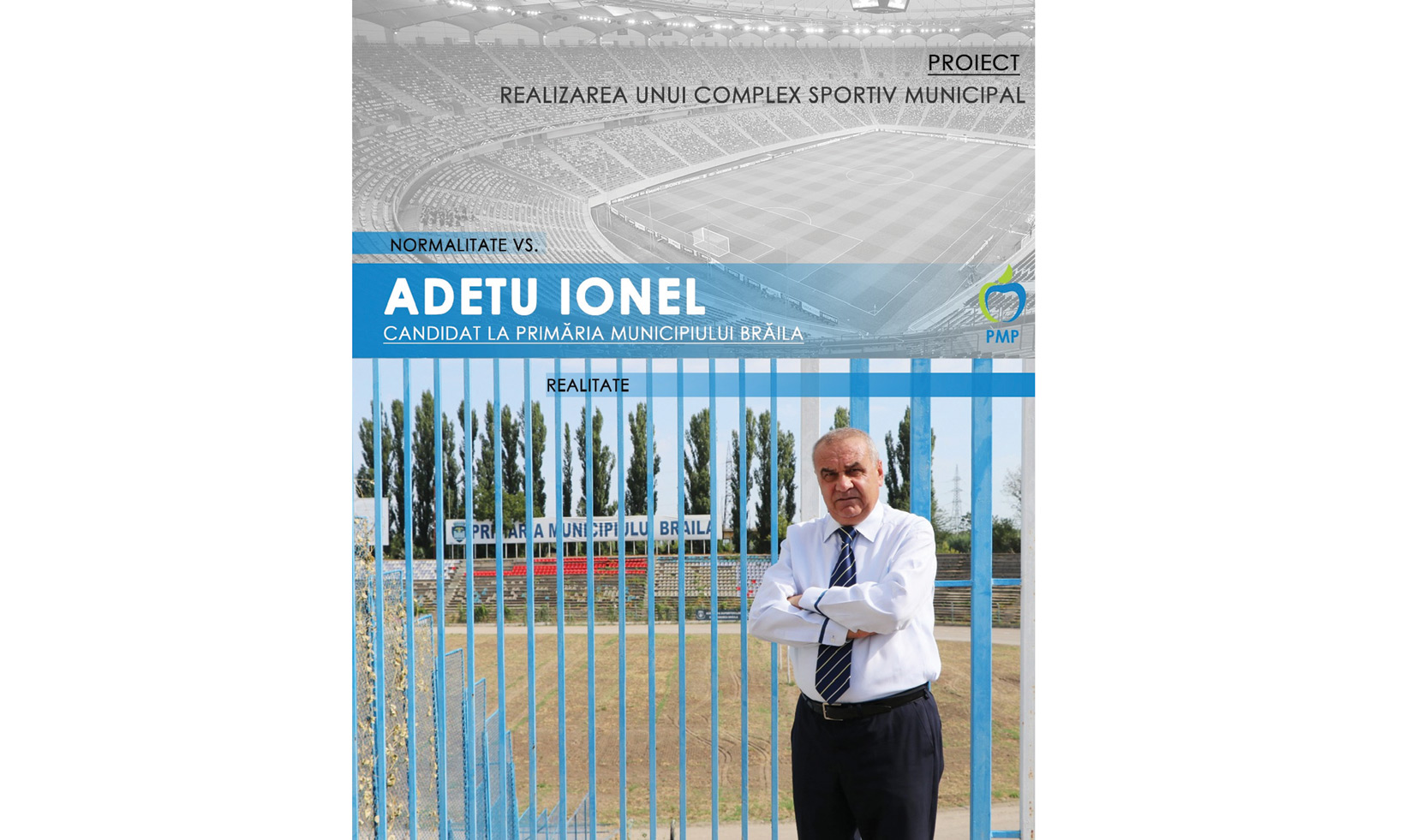 • candidatul PMP la funcţia de Primar al Municipiului Brăila s-a înscris în campania “Bătălia pe proiecte” cu un plan privind realizarea unui complex sportiv municipal în Parcul Monument, pe locul vechiului stadion de fotbal • un stadion de fotbal cu o capacitate de 12.000-14.000 de locuri, reabilitarea stadionului de atletism, modernizarea Sălii Polivalente, teren de baschet, teren de volei şi piste de bowling, toate aceste obiective ar urma să fie realizate prin implementarea proiectului