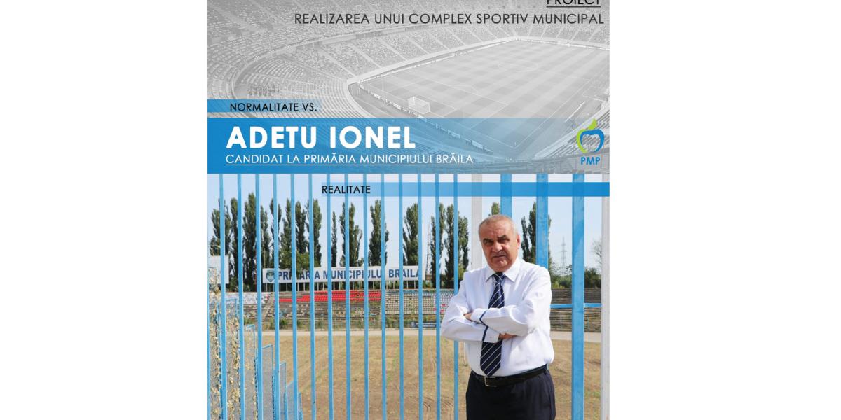 Ionel Adetu, candidat la funcţia de Primar al Municipiului Brăila din partea Partidului Mişcarea Populară (PMP) s-a înscris în campania “Bătălia pe proiecte” lansată de cotidianul “Obiectiv”. În proiectul trimis, Ionel Adetu propune realizarea unui complex sportiv municipal în Parcul Monument, pe locul vechiului stadion de fotbal, care va cuprinde: stadion de fotbal cu o capacitate de 12.000-14.000 de locuri, reabilitarea stadionului de atletism, modernizarea Sălii Polivalente, teren de baschet, teren de volei şi piste de bowling. Candidatul PMP Brăila la Primărie susţine că acesta este un proiect de suflet, care va încuraja practicarea sportului de performanţă, va atrage turişti prin organizarea de competiţii de anvergură şi va reanima viaţa sportivă şi culturală a Brăilei. Costurile implementării acestui proiect se ridică la 25-30 de milioane de euro, iar sursa de finanţare identificată de Adetu sunt fondurile ce pot fi obţinute de la Compania Naţională de Investiţii.