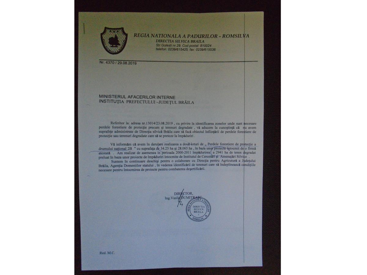 • silvicultorii brăileni au în derulare un amplu proiect de realizare a două perdele forestiere de protecţie a Drumului Naţional 2B, în valoare de 1,43 milioane de euro • peste 60 de hectare de pădure vor proteja drumul naţional şi terenurile agricole şi vor combate fenomenul deşertificării • silvicultorii au împădurit, deja, 3.000 de hectare de teren degradat, preluat de la Administraţia Domeniilor Statului şi de la fostele CAP-uri • “Scopul investiţiei: atenuarea adversităţilor climatice (inundaţii, fluctuaţii mari ale temperaturii), ameliorarea condiţiilor pedoclimatice şi refacerea echilibrului ecologic în zonă”, precizează ing. Cosmina Moisei, de la Direcţia Silvică Brăila