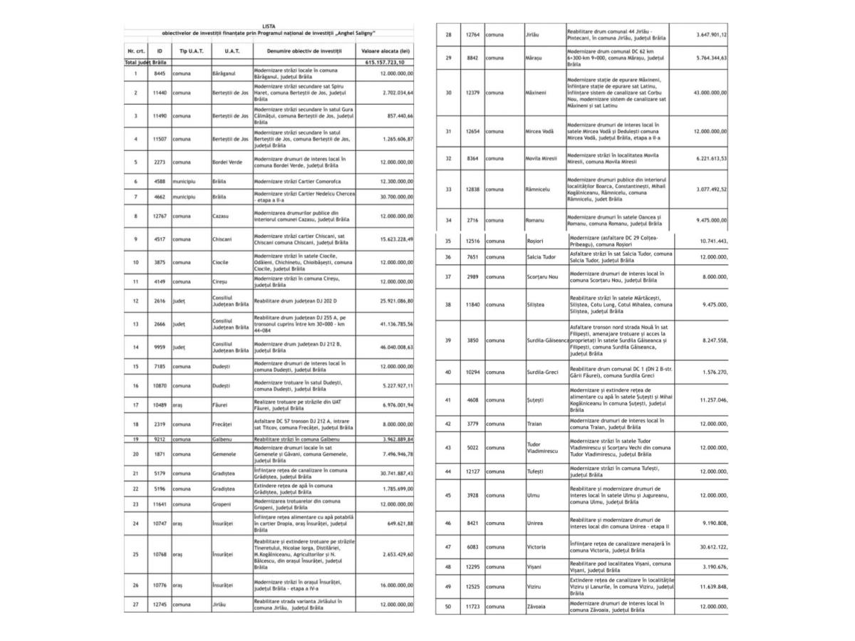 Cincizeci de proiecte în valoare de 615 milioane lei au primit undă verde în Programul Naţional de Investiţii ”Anghel Saligny” pentru Judeţul Brăila de la nivelul Ministerului Dezvoltării, condus de vicepremierul Sorin Grindeanu. Mai precis 615.157.723,10 lei. Anunţul a fost făcut recent de către preşedintele Consiliului Judeţean Brăila, Francisk Iulian Chiriac, în cadrul unei postări pe reţelele de socializare. Potrivit şefului CJ Brăila, din suma totală amintită, 110 milioane lei sunt bani ce vor merge strict la proiectele instituţiei pe care o conduce.