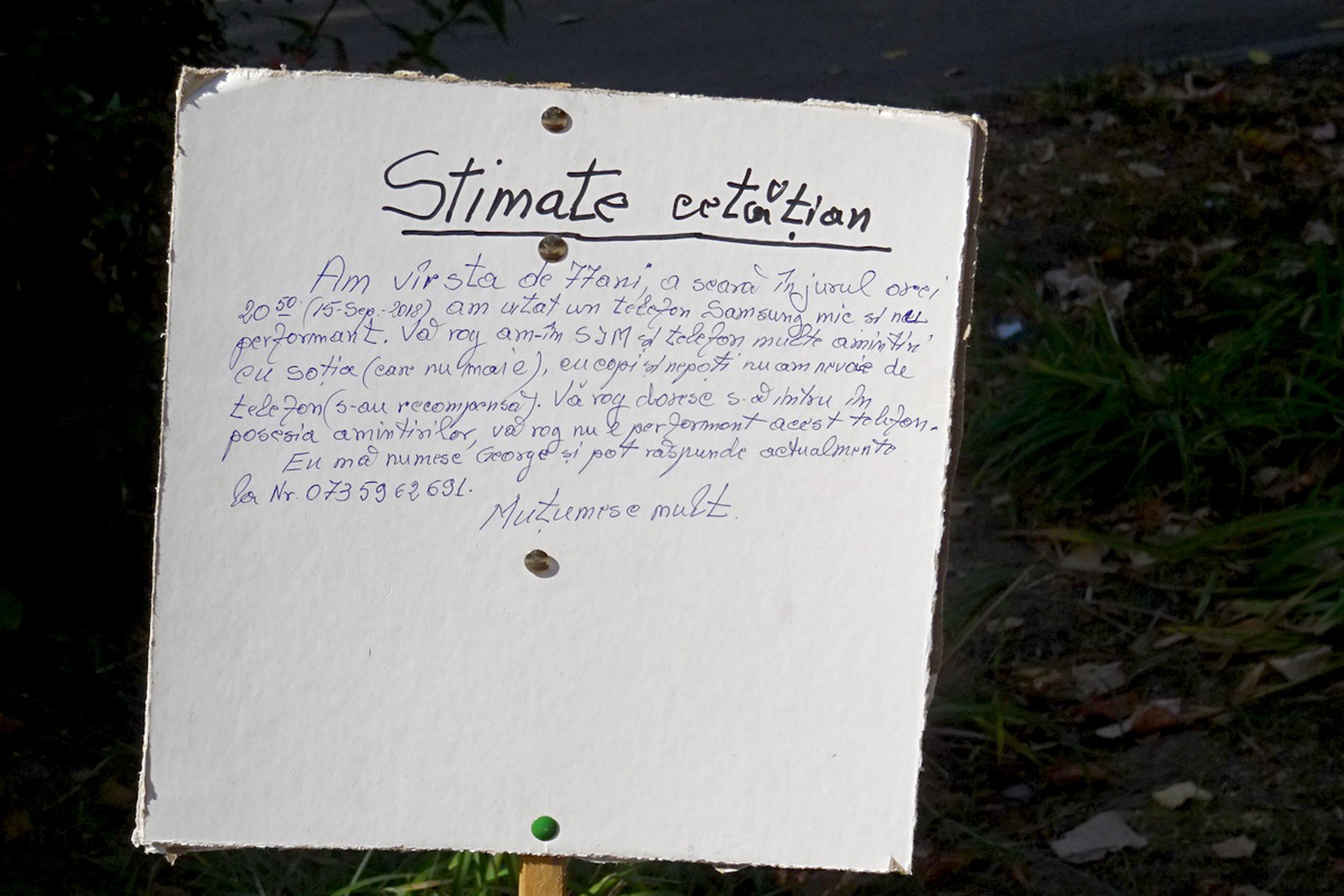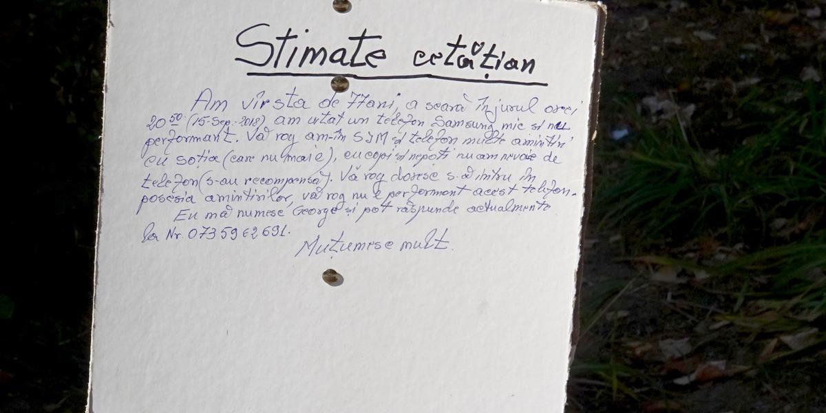 Un pensionar brăilean în vârstă de 77 de ani încearcă prin toate mijloacele de care dispune să îşi recupereze un telefon mobil uitat pe o bancă de pe bulevardul Independenţei. Deocamdată, mijloacele sunt puţine şi tot ce a putut face bătrânul a fost să pună un anunţ scris pe o bucată de carton prinsă în piuneze de un băţ, în dreptul băncii unde ştie că şi-a uitat telefonul, în seara zilei de sâmbătă, 15 septembrie. În anunţul stângaci scris pe carton, pensionarul menţionează că telefonul pierdut, marca Samsung, este unul vechi şi neperformant, însă el ţine foarte mult să îl recupereze deoarece avea înregistrate pe el fotografii cu soţia sa, care acum “nu mai e” printre noi, dar şi cu copiii şi cu nepoţii. “Doar pentru amintirile pe care le am pe memoria acelui telefon l-aş ruga pe cel care l-a găsit să mi-l înapoieze. Eu ştiu că e o lege care interzice să păstrezi un bun găsit pe domeniul public, dar vreau să menţionez că nu vreau să-i fac absolut niciun rău celui care mi-a găsit telefonul şi nu mi l-a înapoiat sau nu l-a predat la Poliţie. Dimpotrivă, chiar sunt dispus să-i dau o mică recompensă. Din câte am înţeles de la operatorul de telefonie mobilă, telefonul a fost găsit şi s-a vorbit de pe el. Între timp, SIM-ul a fost blocat, iar eu mi-am luat un alt SIM. Bănuiesc că a fost găsit de nişte puşti care se gândesc că pot să îl vândă, dar mai mult de 50 de lei nu au cum să ia pe el, că e vechi şi neperformant. 50 de lei le dau eu, numai să mi-l aducă înapoi, ca să pot recupera amintirile pe care le am acolo, cu soţia şi nepoţeii”, ne-a spus bătrânul.
