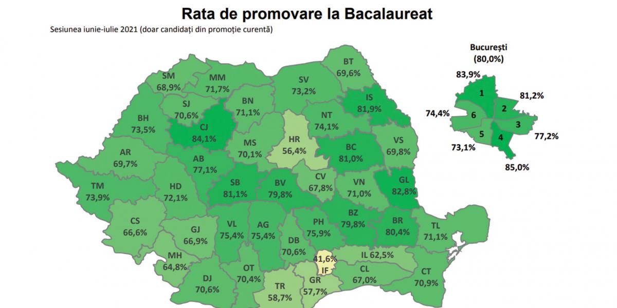 rata cumulată de promovare (înainte de contestații) este de 67,8%, în creștere cu aproape 5% față de anul trecut: 62,9%). Pentru promoția curentă, rata de promovare este 73,9% (un plus de 2,5%, comparativ cu aceeași etapă din sesiunea iunie-iulie 2020: 71,4%), iar pentru promoțiile anterioare, 27,6% (o majorare de 2,6%, comparativ cu sesiunea iunie-iulie 2020: 25%).