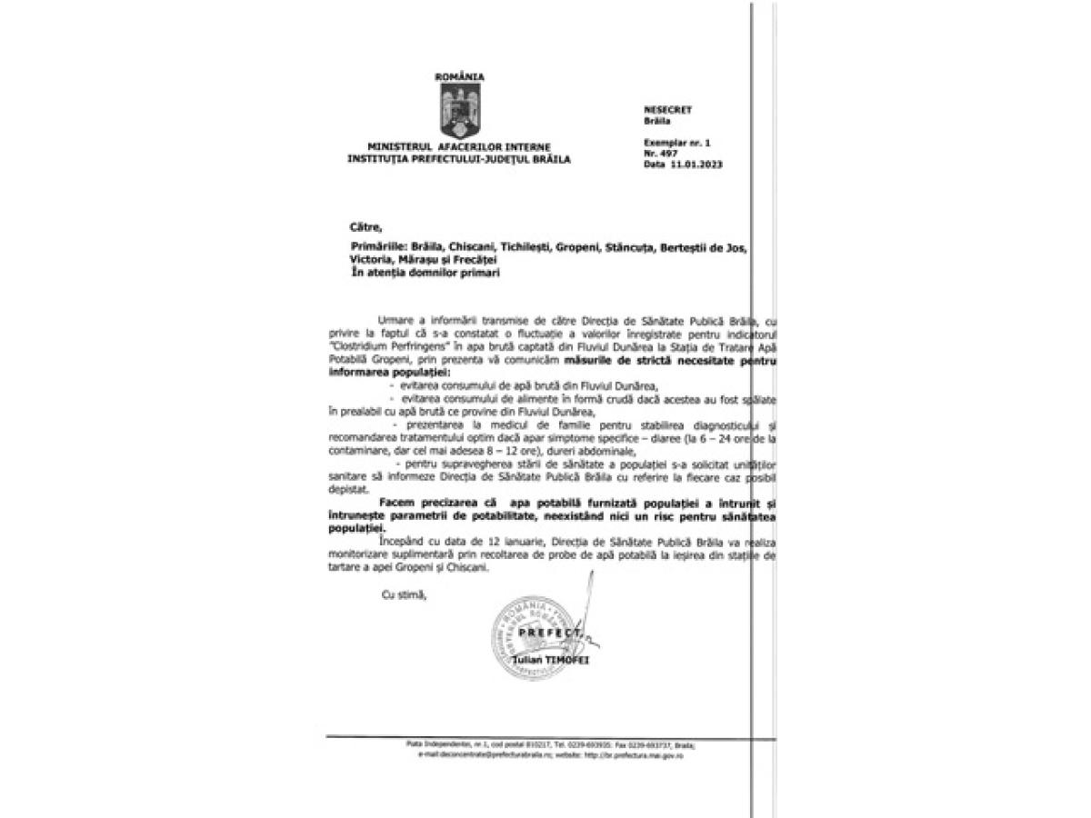 Potrivit unui comunicat al Prefecturii Brăila, urmare a informării transmisă, în cursul serii de miercuri, 11 ianuarie, de către Direcția de Sănătate Publică Brăila, cu privire la faptul că operatorul unic Compania de Utilități Publice „Dunărea” Brăila a constatat o fluctuație a valorilor înregistrate pentru indicatorul Clostridium Perfringens în apa brută captată din Fluviul Dunărea la Stația de Tratare Apă Potabilă Gropeni, prefectul județului, Iulian Timofei, a convocat, la ora 20.30, o ședință de lucru cu reprezentanții conducerii Direcția de Sănătate Publică Brăila, Gărzii de Mediu - Comisariatul Județean Brăila, Serviciului de Gospodărire a Apelor Brăila, Inspectoratului pentru Situații de Urgență „Dunărea” Brăila.