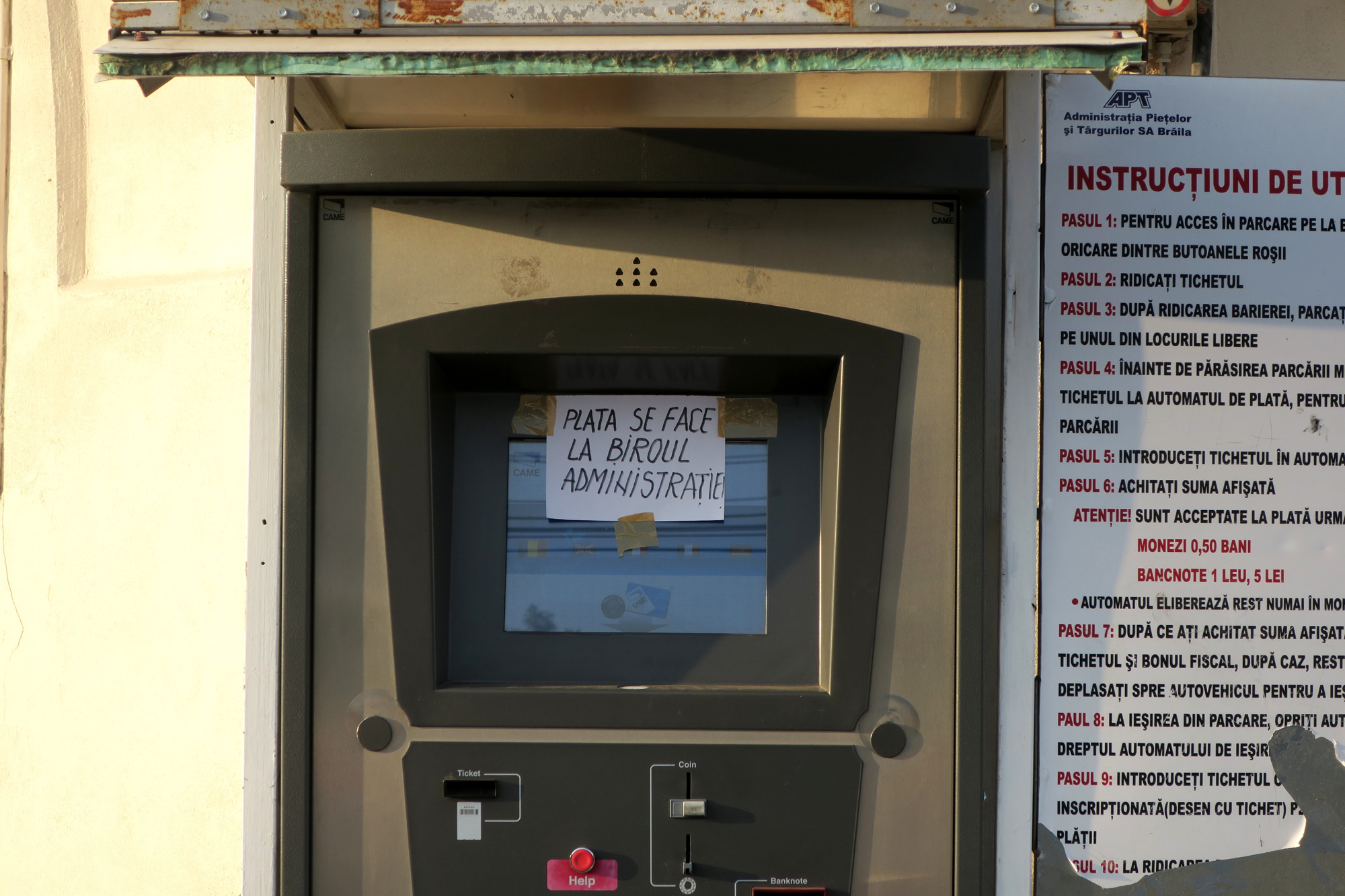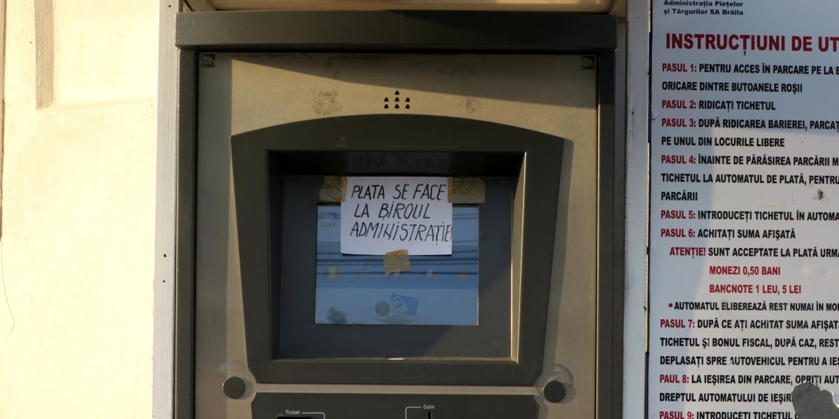 Pe ecranul automatului de bilete este prins cu bandă scotch un anunţ prin care şoferii sunt îndrumaţi să meargă la administraţia pieţei pentru a plăti locul de parcare. Cu toate acestea, directorul ADP, Meluţa Drăguţ, ne-a declarat telefonic că de fapt atât automatul de bilete cât şi bariera de la intrare în parcare ar fi funcţionale şi că singura care este scoasă momentan din uz este bariera de la ieşire. Potrivit directorului Drăguţ, şoferii care intră în parcare îşi scot din automat tichetul unde este înscrisă ora de intrare, iar când pleacă un angajat îi aşteaptă la ieşire, îi taxează în funcţie de timpul cât au stat în parcare, în baza tichetului, şi ridică manual bariera. Directorul Meluţa Drăguţ a precizat că problemele existente au fost cauzate de unii brăileni care vandalizează aparatura de taxare şi barierele. “Ne confruntăm foarte des cu astfel de incidente. Lovesc barierele intenţionat cu maşina, bagă chibrituri sau tot felul de alte obiecte în interiorul instalaţiilor, ca să le blocheze. Avem camere de supraveghere, iar pe unii i-am prins asupra faptului, i-am dat în judecată şi i-am obligat să plătească pagubele provocate... În ceea ce priveşte problema actuală, e nevoie de înlocuirea unei piese, ca să punem din nou bariera în funcţiune. S-a vorbit la firma de mentenanţă de la Bucureşti, s-a făcut comandă şi chiar azi (ieri n.n.) îi aşteptăm să vină să facă reparaţia”, ne-a declarat, ieri, directorul Meluţa Drăguţ.