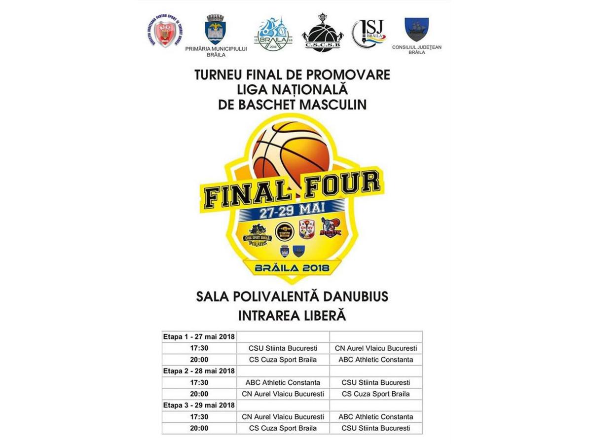• “Să dăm dovadă de solidaritate şi să-l ajutăm”, este îndemnul conducerii echipei Cuza Sport cu prilejul turneului final al Ligii I la baschet masculin • competiţia, care se desfăşoară în perioada 27-29 mai, este o premieră pentru oraşul nostru • participă patru echipe: Cuza Sport Brăila, CSU Ştiinţa Bucureşti, Colegiul Naţional Aurel Vlaicu Bucureşti şi ABC Athletic Constanţa • primele două clasate promovează în Liga Naţională • “Aşteptăm lumea la sală, împreună să ne vedem visul împlinit”, a declarat Mircea Totolici