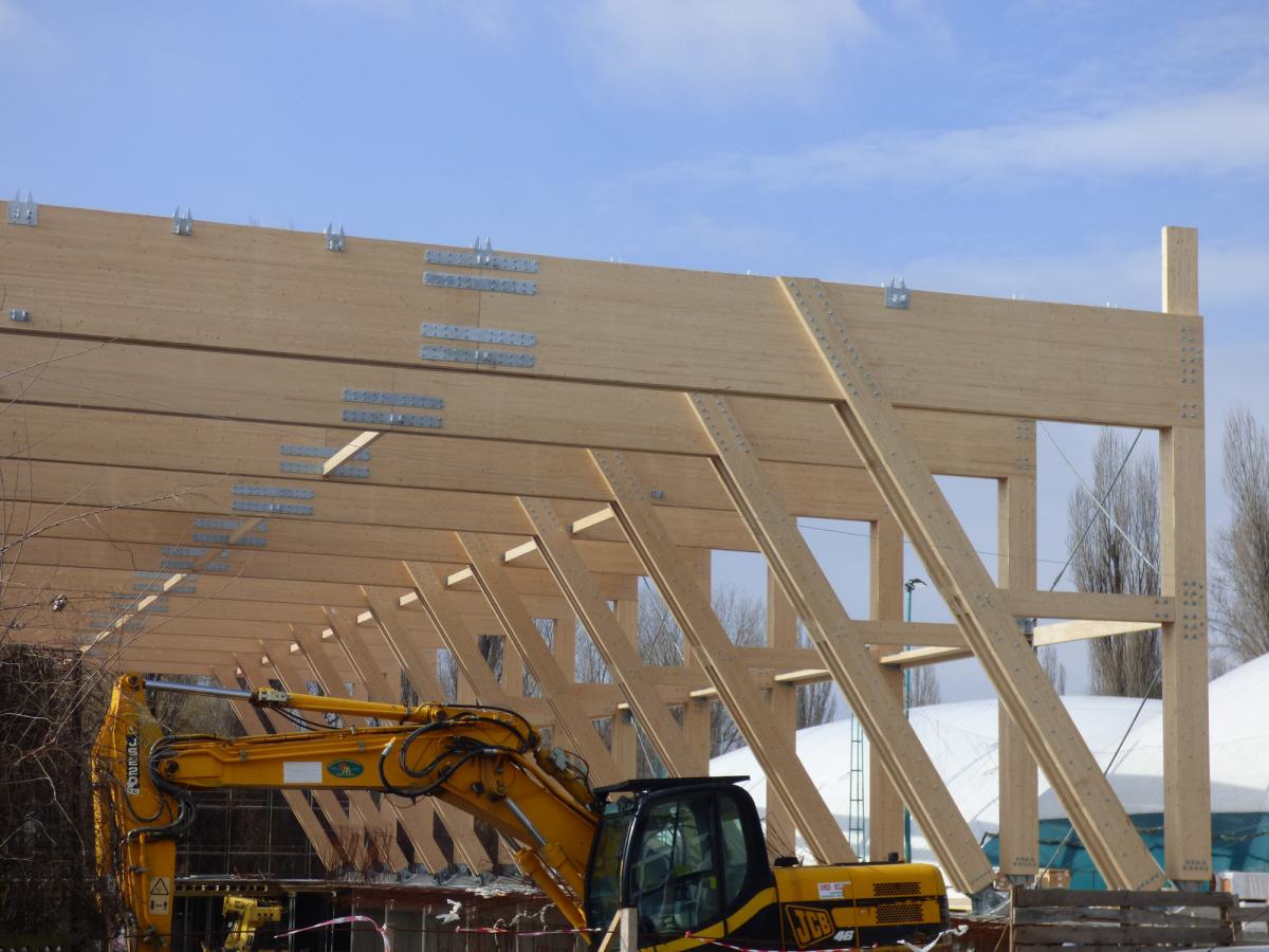 Revenind la tehnologiile folosite în edificarea obiectivului, în primul rând atrag atenţia grinzile de susţinere a acoperişului, realizate din lemn de brad (românesc) stratificat, pentru o deschidere foarte mare a clădirii, ce acoperă un bazin de 50/25 metri (cu 10 culoare competiţionale) şi posibilitatea amenajării a încă unui bazin, de 25/12,5 metri. Tot pentru prima dată, discutabilul polistiren expandat se înlocuieşte cu modernul material termoizolant realizat din vată bazaltică, adus din Elveţia. Geamurile vitrate şi ţinuta/faţada ultramodernă a bazinului vor aduce un plus de renume şi pentru zestrea arhitectonică a Brăilei. Tribunele includ 900 de locuri, la care se vor mai adăuga încă 400 de locuri, iar ca anexe sunt prevăzute: o saună, spaţii pentru transmii media, vestiare, sală de forţă, grup sanitar, cabinet medical şi unul antidoping, o cofetărie etc. Cum spuneam, lucrările de drenaj au fost o prioritate maximă, iar pentru consolidarea terenului de fundare a fost nevoie de două luni pentru executatrea a 1.000 de piloni foraţi şi încastrarea la mare adâncime a unor palplanşe metalice menite să consolideze taluzul dinspre arena gonflabilă. Şi să reţinem că o foarte mare problemă pentru constructor a fost şi este spaţiul foarte îngust din jurul bazinului, cu efecte negative privind organizarea de şantier şi imposibiltatea ca execuţia acoperişului să aibă loc simultan cu realizarea bazinului.