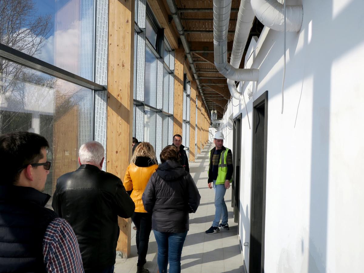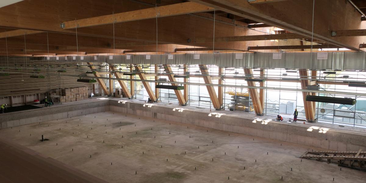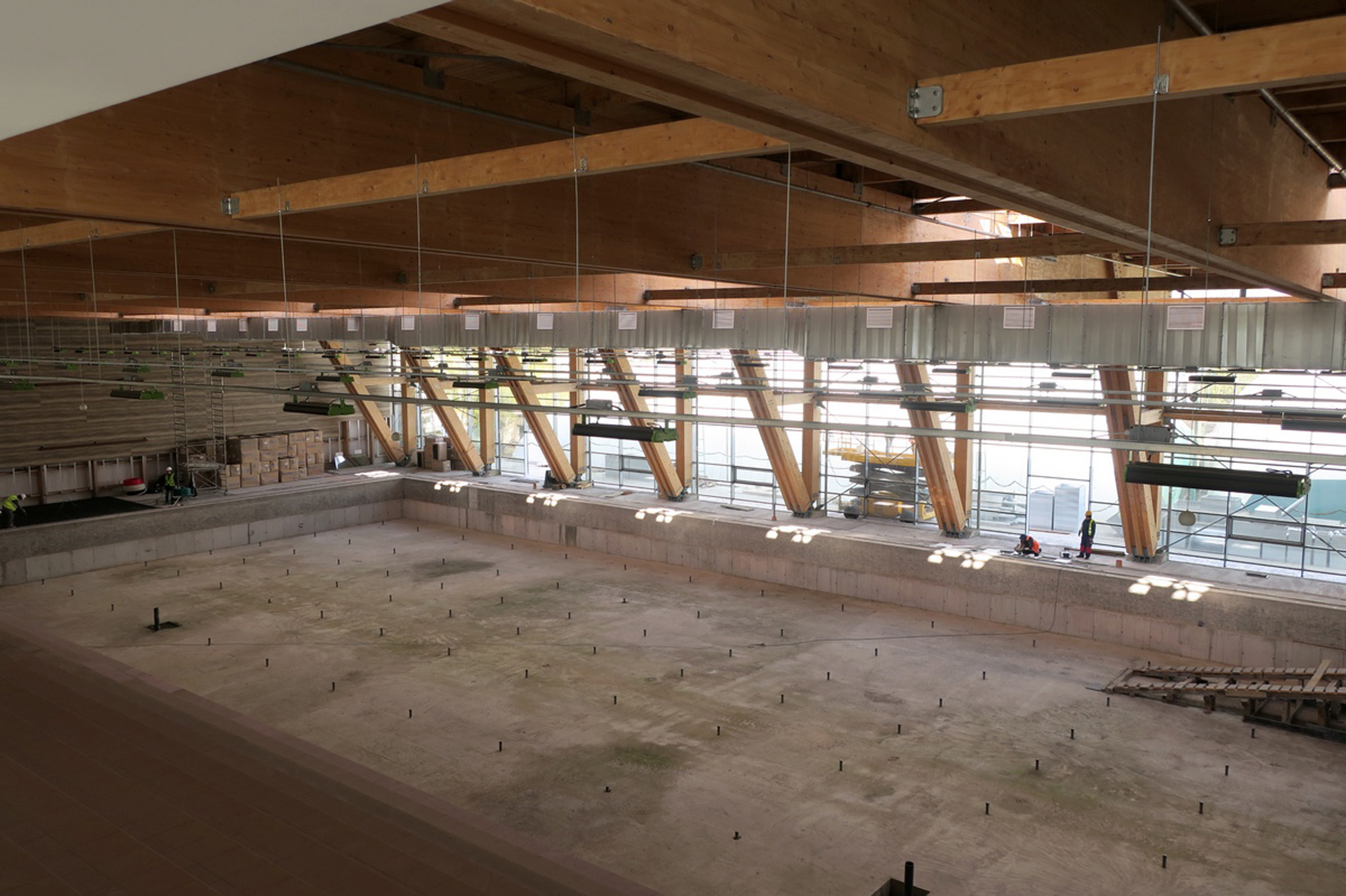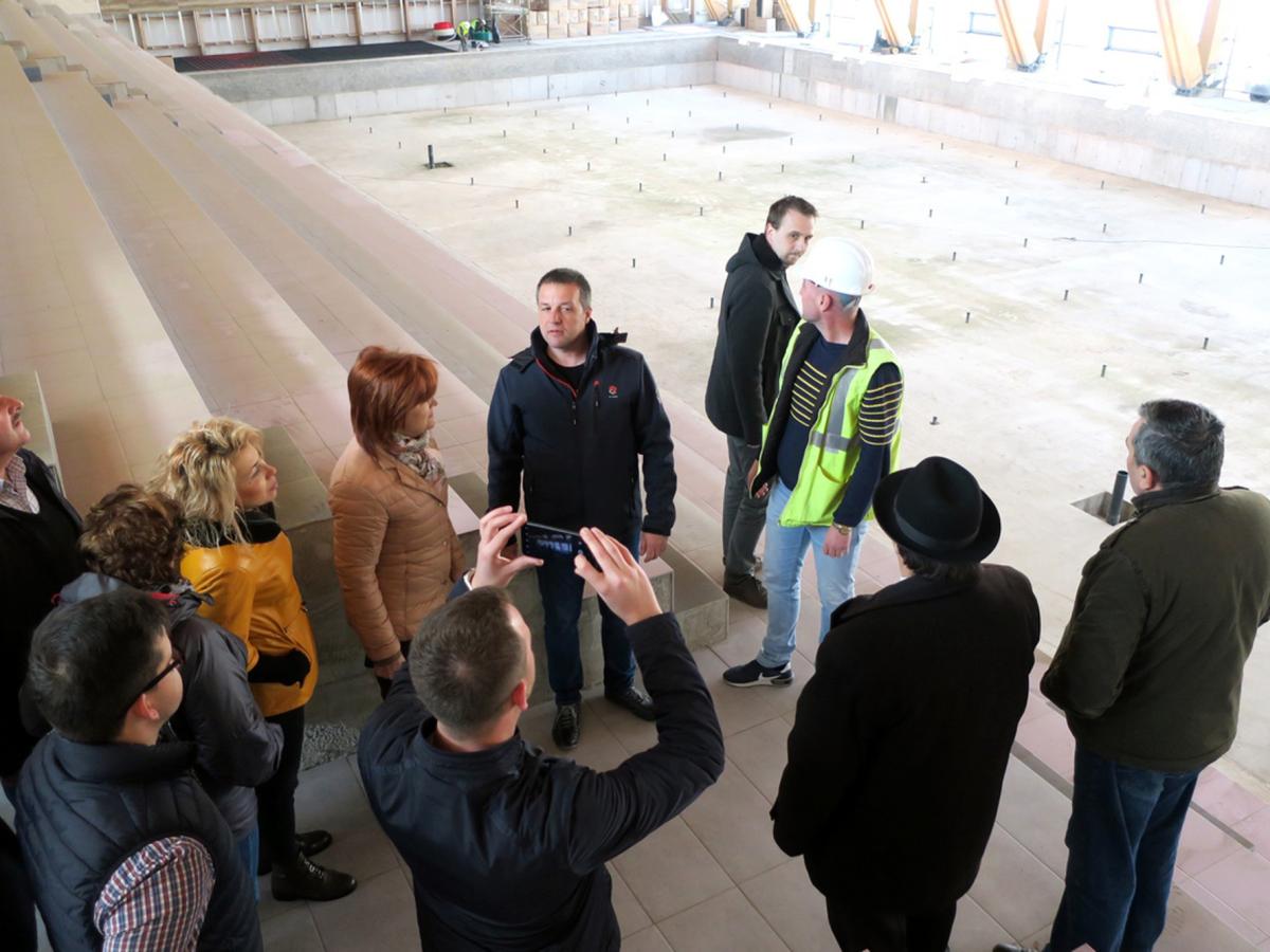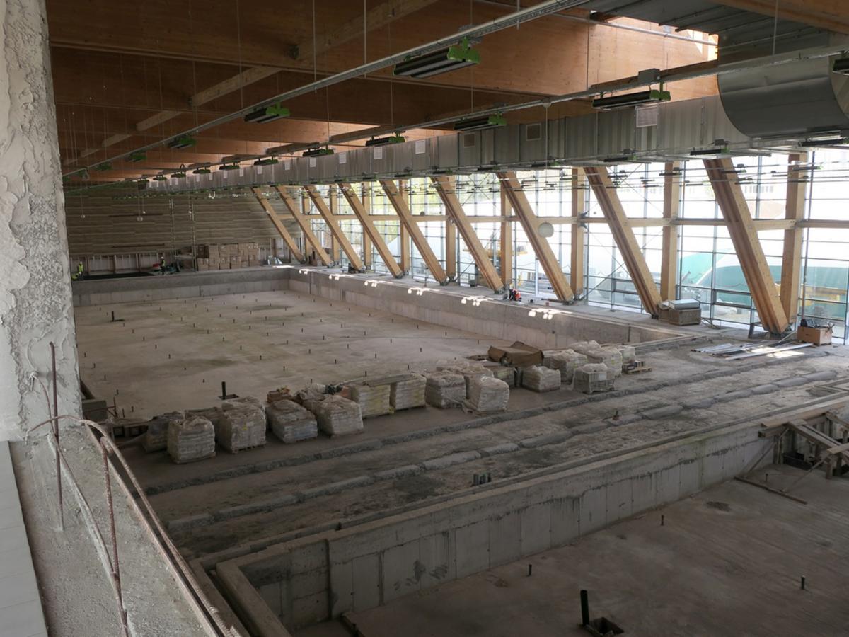 Vineri, când a fost vizitată incinta uriaşei săli cu capacitatea de 800 de locuri ce adăposteşte atât bazinul olimpic cât şi un bazin mai mic, pentru antrenamente, se lucra la montarea instalaţiei de încălzire în pardoseală. Ca lucrări de executat, ar mai fi placarea celor două bazine, montarea scaunelor, montarea parapeţilor de sticlă care delimitează zona destinată spectatorilor, plus alte finisaje specifice, la sala de fitness, vestiare, sala de presă şi celelalte spaţii ale complexului sportiv ce ar urma să găzduiască, printre altele, inclusiv o cofetărie. Consilierii municipali s-au declarat impresionaţi de felul cum este structurată clădirea în interior şi mai ales de grinzile de lemn din componenţa structurii de rezistenţă. Făcute dintr-un lemn special şi tratate astfel încât să facă faţă şi umezelii dar şi unui eventual incendiu, aceste grinzi oferă un aspect cu totul aparte noului complex sportiv construit la Brăila.