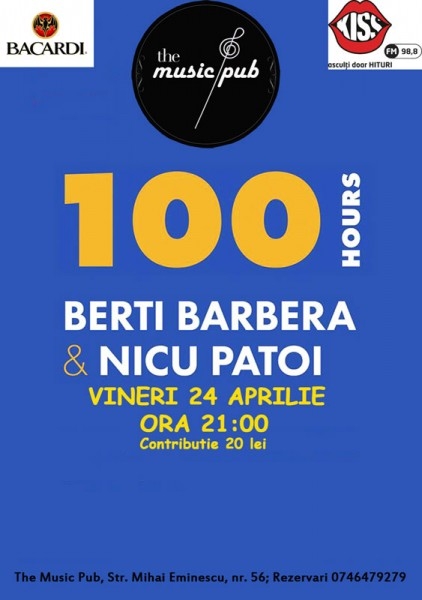 The Music Pub va fi, vineri, gazda unui super concert susţinut de Berti Barbera şi Nicu Patoi. Artiştii vor lansa albumul "100 Hours", care a fost realizat în interiorul unui studio aşa cum au simţit cei doi prieteni de-o viaţă. Spectacolul va începe la ora 21.00, preţul biletului fiind de 20 de lei.