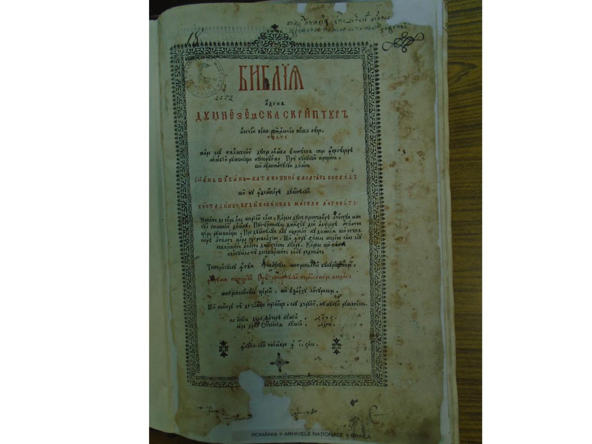 Printre aceste “nestemate” se numără şi Biblia de la Bucureşti (1688), numită şi Biblia lui Şerban Cantacuzino, după numele domnitorului care a hotărât tipărirea ei. Adevărat monument al limbii române vechi, Biblia de la 1688 a ajuns, prin cine ştie ce împrejurări, la Brăila, şi a fost la un pas de a fi distrusă, în timpul epurărilor comuniste din anii '50, când aparţinea de Biblioteca Orăşenească. A fost salvată de profesorul Nicolae Mocioiu, fostul director al Arhivelor, restaurată timp de un deceniu la Bucureşti, iar acum este păstrată la loc de cinste, în tezaurul instituţiei. Despre odiseea celei dintâi Biblii româneşti, citiţi în rândurile care urmează.