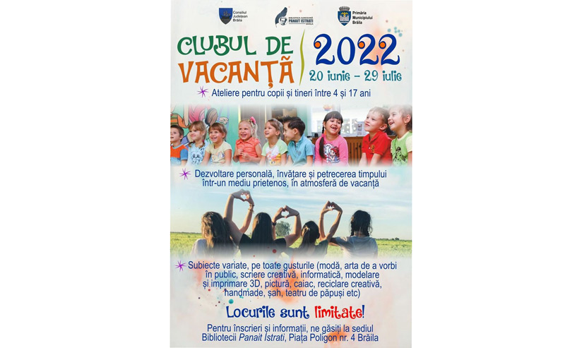 Biblioteca Județeană ”Panait Istrati” Brăila anunță că organizează ”Clubul de vacanță”, ediția de vară 2022, în perioada 20 iunie – 29 iulie. Ediția de anul acesta va cuprinde 25 de ateliere, iar înscrierile se pot face la Mediateca Bibliotecii Județene din Piața Poligon nr. 4, de luni până vineri între orele 08:00 și 19:00 și sâmbăta între orele 08:00 și 16:00, cu mențiunea că un participant se poate înscrie la maxim trei ateliere.
