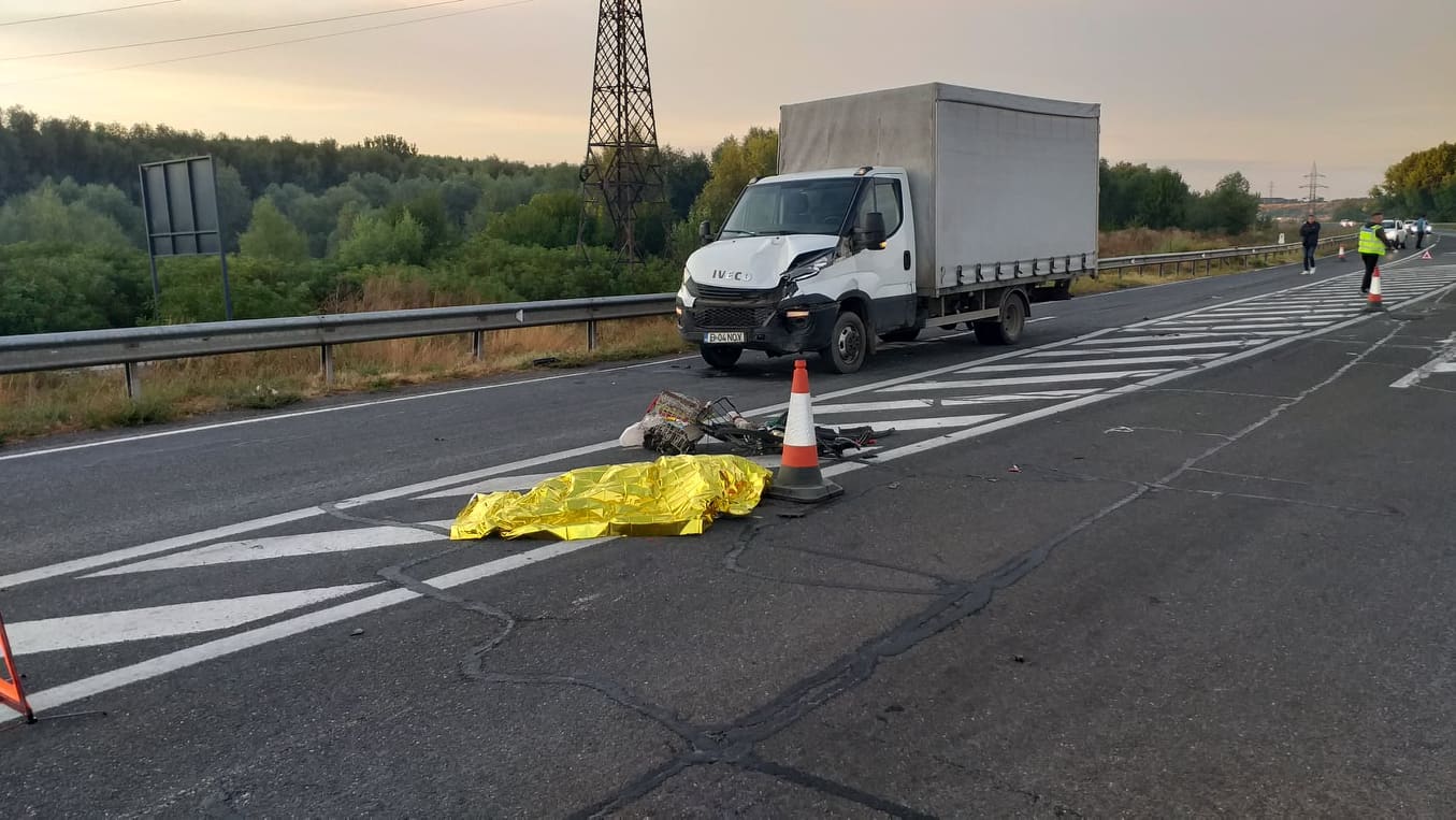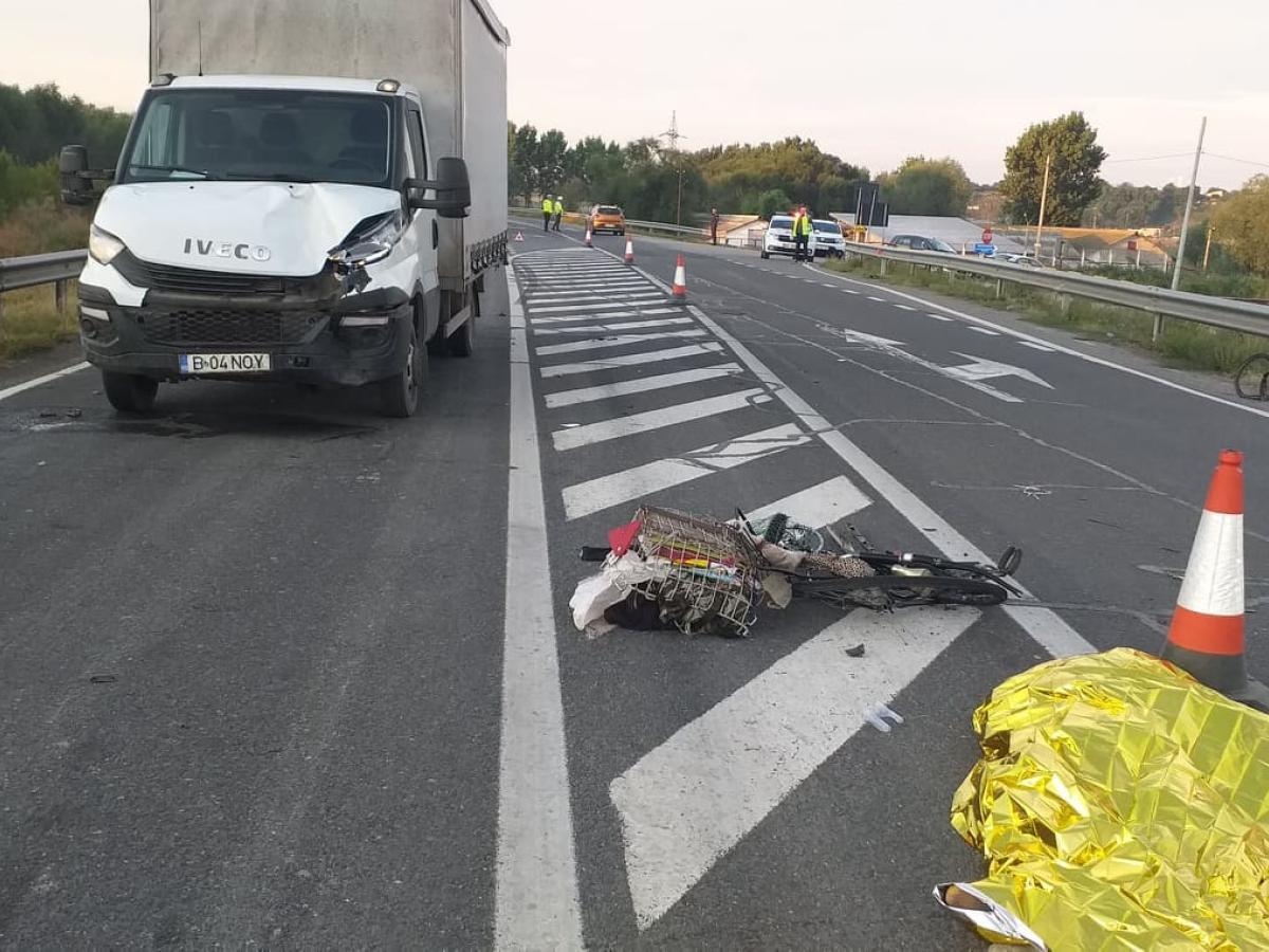 * în această dimineață, în jurul orei 06.10, un bărbat se deplasa pe drumul de acces dinspre stația de epurare, pe o bicicletă, fără a purta vestă reflectorizantă * el s-ar fi angajat să pătrundă în intersecția cu DN 22B, fiind acroșat de o autoutilitară * în urma impactului, biciclistul care nu a fost încă identificat nu a mai scăpat cu viață * un alt biciclist, care era băut, a fost accidentat aseară de un șofer în municipiu