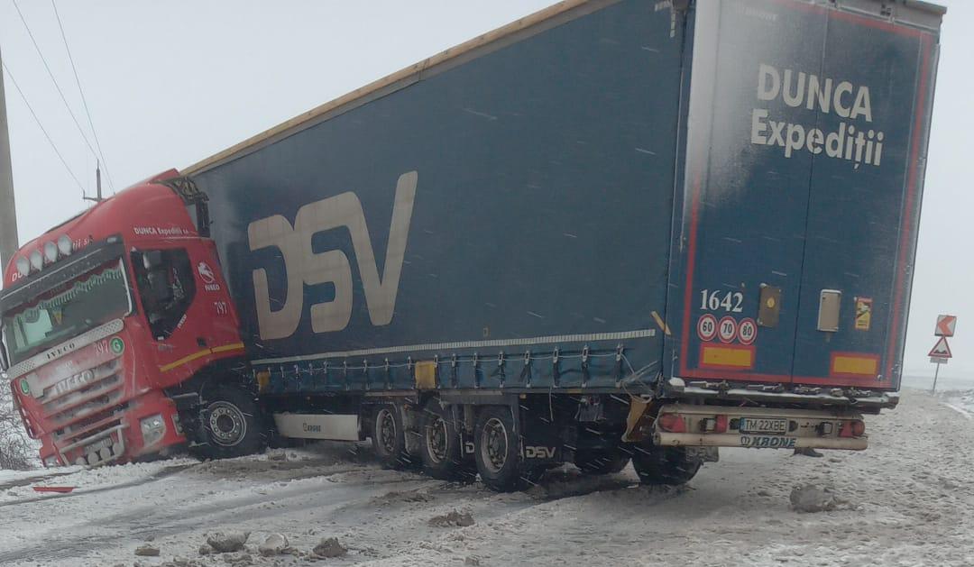 Codul galben provoacă probleme în trafic! Şoferul unui TIR nu a adaptat viteza, pe DN 2B, şi a blocat şoseaua pe ambele sensuri. Un alt autovehicul ar fi frânat și a părăsit partea carosabilă.