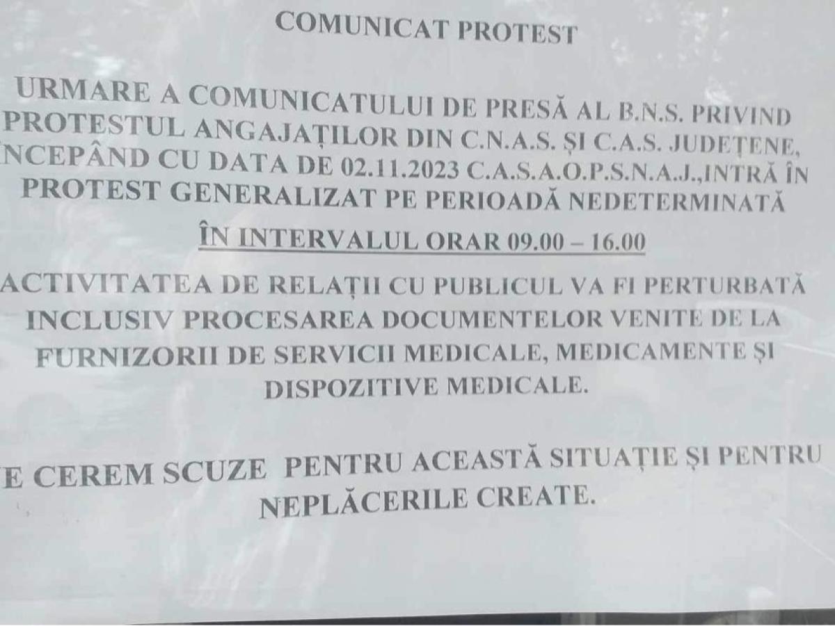 * greva angajaților din casele județene de asigurări de sănătate și CNAS s-a prelungit și vineri, 3 noiembrie, iar asta a stârnit deja un val de nemulțumiri în rândul asiguraților * vineri, la primele ore ale dimineții, mai mulți brăileni care aveau nevoie de adeverințe de asigurat sau de schimbarea cardului de sănătate au plecat, nedumeriți și supărați, înapoi spre casă, după ce au aflat că ”nu se poate” * pe ușa instituției, era afișat: ”Protest generalizat pe perioadă nedeterminată”