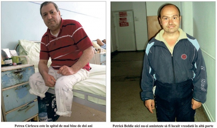 "Lucram ca mecanic de centrală termică la Însurăţei, din 1986. Mi-au degerat picioarele într-o noapte şi am ajuns la spital. Mi s-au amputat ambele picioare. Şi am ajuns aşa cum mă vedeţi. (N.R. Arată spre femururile ciunte.) Nu am pe nimeni, nu am avut pe nimeni. Casa părintească s-a dărâmat. Nu mai am nici acte, nici buletin, nimic. Nu am mutaţie şi nici pensie sau alt venit. Stau la spital de doi ani, aici mi-e şi casa şi masa, aşa vrea Dumnezeu, e greu, dar nu ştiu ce să fac, sunt fără putere", ne povesteşte Petrea Cărlescu, încercând să ne evite privirea, doar, doar nu i-om zări lacrimile ce-i joacă în colţul ochilor.