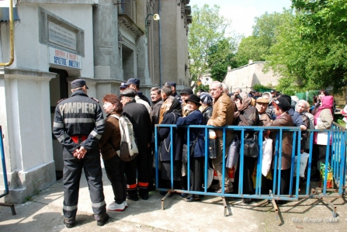 În mulţimea de oameni care aştepta să intre sub altar, se zăreau de la depărtare rromii de la Iveşti, care vin an de an la Biserica Greacă. Ele, îmbrăcate cu bluze şi fuste de un alb imaculat, cu părul împletit şi cu multe podoabe aurite. Ei, cu pardesiu negru, cu cămasă închisă la culoare pe sub haină, pantaloni din stofă şi pantofi lăcuiţi. Răbdători şi tot timpul cu zâmbetul pe buze la vederea jurnaliştilor, înaintau câte puţin spre altar. „Noi folosim apa sfinţită să stropim prin casă, apoi o turnăm în fântâni", ne-a povestit una dintre femeile rrome.