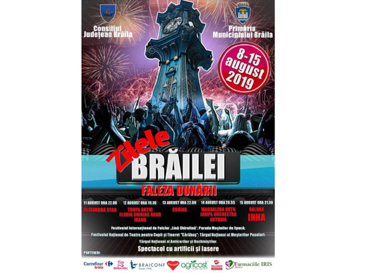 • până pe data de 15 august, în mai multe zone din oraşul nostru vor avea loc manifestări şi spectacole dedicate Zilelor Brăilei •printre acestea se numără: Festivalul Internaţional de Folclor “Lină Chiralină”, Parada maşinilor de epocă, Festivalul Naţional de Teatru pentru Copii şi Tineret “Cărăbuş”, Târgul Naţional al Meşterilor Populari, Târgul Naţional al Anticarilor şi Buchiniştilor, recitaluri şi Spectacol cu artificii şi lasere