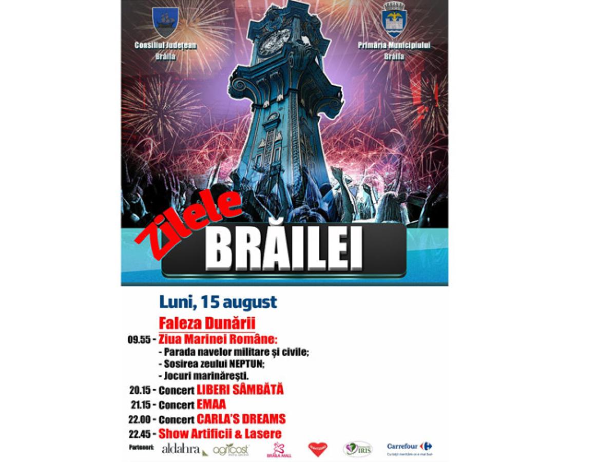 Totul va culmina cu Ziua Marinei Române (luni, 15 august) care va fi sărbătorită, ca de obicei, pe Faleza Dunării. Astfel, la ora 9.55, va avea loc Parada navelor militare și civile din Portul Brăila, urmată de Sosirea Zeului Neptun și de nelipsitele Jocuri Marinărești. În aceeași zi, brăilenii sunt invitați la concertele susținute de Liberi Sâmbătă (20.15), EMAA (21.15) și Carla's Dreams (22.00). Zilele Municipiul Brăila se vor încheia în aceeași seară, pe Faleza Dunării, cu un Show incendiar de lasere și artificii care va începe la ora 22.45.