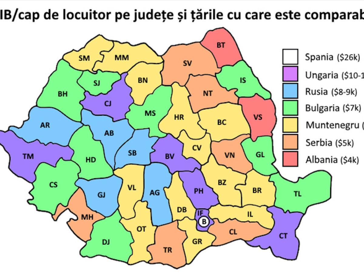 Un studiu realizat de echipa celor de la “România Curată” a făcut o corelaţie între PIB-ul per cap de locuitor al fiecărui judeţ cu acelaşi indicator ale unor ţări europene, concluzia fiind aceea că judeţele mai bogate au un PIB similar unor ţări precum Ungaria (10.000 - 14.000 USD/locuitor), Rusia (8.000 - 9.000 USD/locuitor) ori Bulgaria (7.000 USD/locuitor), în timp ce judeţele sărace sunt la nivelul unor ţări precum Muntenegru (6.000 USD/locuitor), Serbia (5.000 USD/locuitor) şi Albania (4.000 USD/locuitor). Bucureştiul face notă discordantă înregistrând un PIB/locuitor de 26.000 USD, asemănător Spaniei, la polul opus fiind Botoşaniul şi Vasluiul cu economii la nivelul Albaniei.