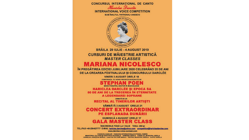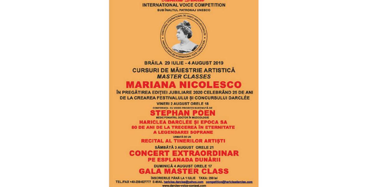 Cursurile de Măiestrie Artistică oferite de soprana Mariana Nicolesco, în contextul Festivalului şi Concursului Internaţional de Canto Hariclea Darclée, manifestări aşezate sub Înaltul Patronaj UNESCO, începute la Brăila pe 29 iulie, continuă. Conferinţa susţinută vineri, 2 august, de Stephan Poen, Medic Foniatru, Doctor în Muzicologie, o va situa în epoca sa pe Hariclea Darclée, artista adorată de public şi venerată de compozitori, prima soprană a lumii timp de peste două decenii. Conferinţa va fi punctată de proiecţii video cu arii în care a triumfat Mariana Nicolesco, arii din opere interpretate cândva şi de Darclée: I Pagliacci de Leoncavallo, Mefistofele de Boito, Carmen de Bizet, Aida de Verdi, Tosca de Puccini. Serata se va încheia cu un Recital al tinerilor artişti cuprinzând pagini din vastul repertoriu al Haricleei Darclée.