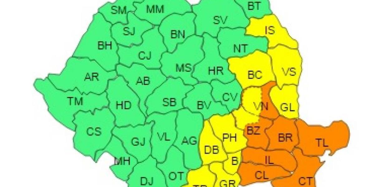 Meteorologii au emis un cod portocaliu de ninsori, viscol și polei pentru sud-estul țării, care va intra în vigoare în această seară, de la ora 22:00, și este valabil până miercuri, la ora 8:00. Sunt vizate șapte județe.