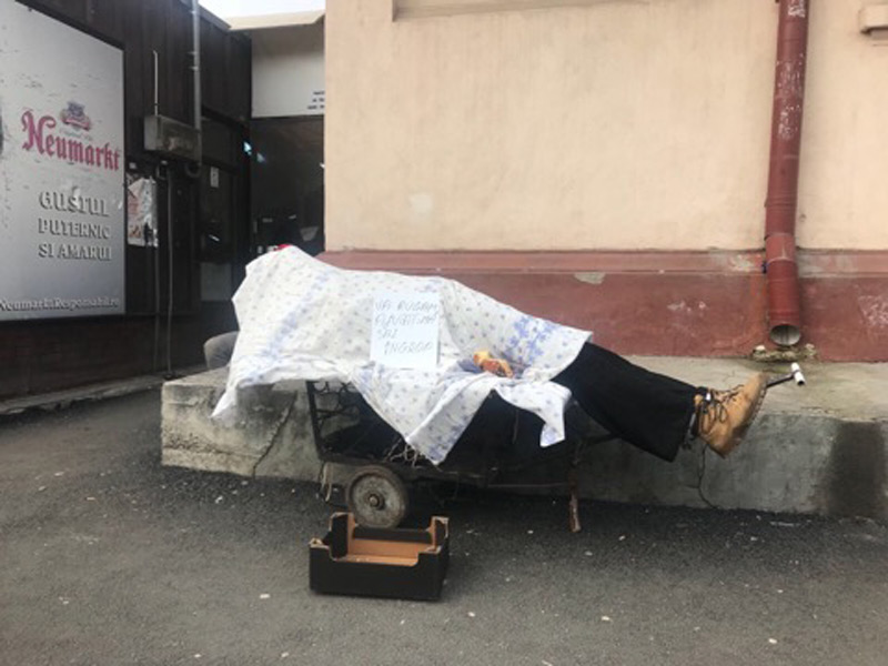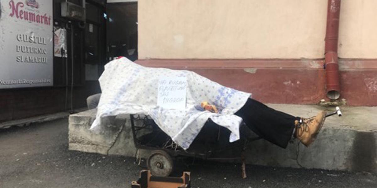• doi tineri din municipiu au apelat la o formă inedită de cerşetorie dar cu nuanţe de-a dreptul macabre: au încercat să păcălească trecătorii că nu au bani să îngroape un mort, folosindu-se de un manechin din plastic pe care l-au plimbat prin zona Piaţa Mare • poliţiştii brăileni i-au identificat şi i-au amendat cu câte 100 lei fiecare • totuşi, un trecător prin zona respectivă a imortalizat manechinul acoperit cu un cearşaf şi cu un bilet lângă el, pe care scria că nu au bani să-l îngroape • imaginile au devenit virale în mediul online