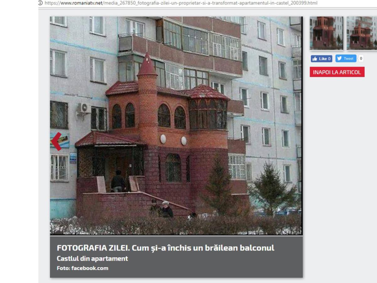 Să nu uităm de faimosul “castel” construit la parterul unui bloc, despre care internetul vuieşte că ar fi din Brăila. Ba chiar imaginea a fost preluată de site-uri de ştiri. Deşi primul articol pe seama acestei fotografii a apărut în anul 2015, ştirea senzaţională şi falsă a fost rostogolită, adică a fost preluată ca “noutate”, chiar în cursul acestei luni de către alte site-uri. Povestea a rămas aceeaşi: un brăilean şi-a transformat balconul apartamentului de la parter în care locuia într-un adevărat castel, ce se întinde ca înălţime până la etajul al doilea al blocului.