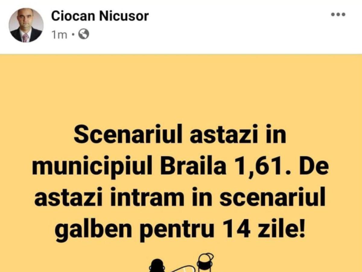 Prefectul județului Brăila Nicuşor Ciocan a anunţat, cu puţin timp în urmă, pe contul său de Facebook, că municipiul Brăila intră, începând de astăzi, sâmbătă, 1 mai, în scenariul galben, ca urmare a scăderii ratei de incidență a infectărilor Covid-19 la 1,61 la mia locuitori. Contactat de un reporter Obiectiv, prefectul ne-a declarat că, astăzi, va fi adoptată de Comitetul Județean pentru Situații de Urgență o hotărâre în acest sens. După cum se știe, județul Brăila are o incidență de sub 3 la mia de locuitori de circa două săptămâni, însă Prefectura a precizat că scenariul galben se instituie atunci când incidența este între 1,5 și 3 persoane la mia de locuitori, calculată în ultimele 14 zile.