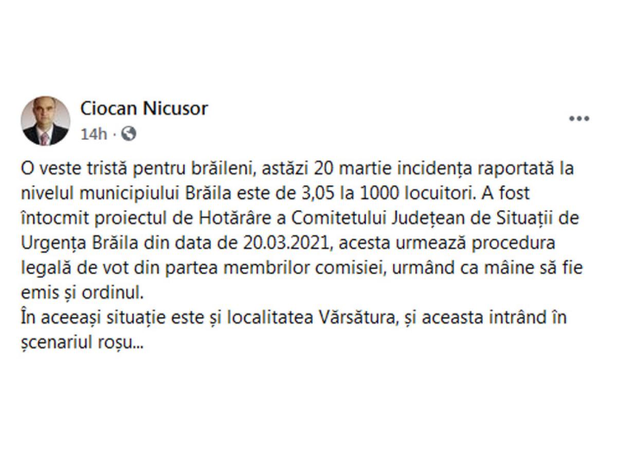 "O veste tristă pentru brăileni, pe 20 martie incidența raportată la nivelul municipiului Brăila este de 3,05 la 1000 locuitori. A fost întocmit proiectul de Hotărâre a Comitetului Județean de Situații de Urgență Brăila din data de 20.03.2021, acesta urmează procedura legală de vot din partea membrilor comisiei, urmând ca duminică să fie emis și ordinul. În aceeași situație este și localitatea Vărsătura, și aceasta intrând în șcenariul roșu..." a scris prefectul pe pagina sa de Facebook.