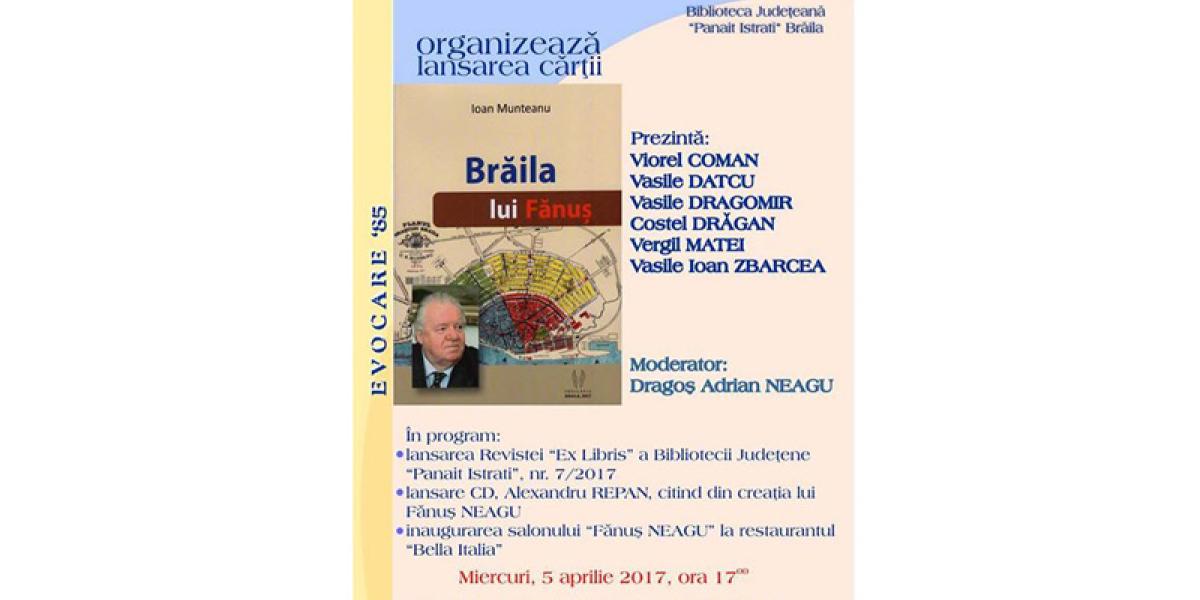 Biblioteca Judeţeană “Panait Istrati” Brăila organizează miercuri, 5 aprilie, ora 17.00, lansarea cărţii “Brăila lui Fănuş”, semnată de prof. Ioan Munteanu. Cartea va fi prezentată de scriitorii Viorel Coman şi Vasile Datcu, de arhitectul şef al Judeţului Brăila- Costel Drăgan, jurnalistul Virgil Matei şi prof. Vasile Ioan Zbarcea. Învitat să prezinte cartea este şi Vasile Dragomir, fost coleg cu Fănuş Neagu la Şcoala Pedagogică “Costache Negri” din Galaţi. Evenimentul este moderat de Dragoş Adrian Neagu, directorul Bibliotecii.