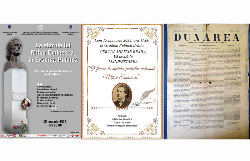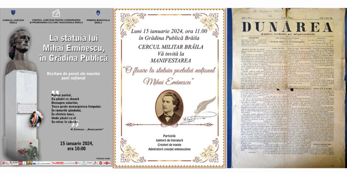 Primul eveniment dedicat „poetului nepereche” este cel organizat luni, 15 ianuarie 2024, începând cu ora 10.00, la statuia lui Mihai Eminescu, din Grădina Publică (bustul din bronz fiind realizat în anul 1989, în urma demersurilor prof. Gheorghe Calotă) de Centrul Județean pentru Conservarea și Promovarea Culturii Tradiționale Brăila (Centrul de Creație), cu sprijinul Consiliului Județean și al Primăriei Municipiului Brăila. Cu acest prilej, vor fi recitate versuri din creația poetului național și vor fi depuse jerbe de flori.