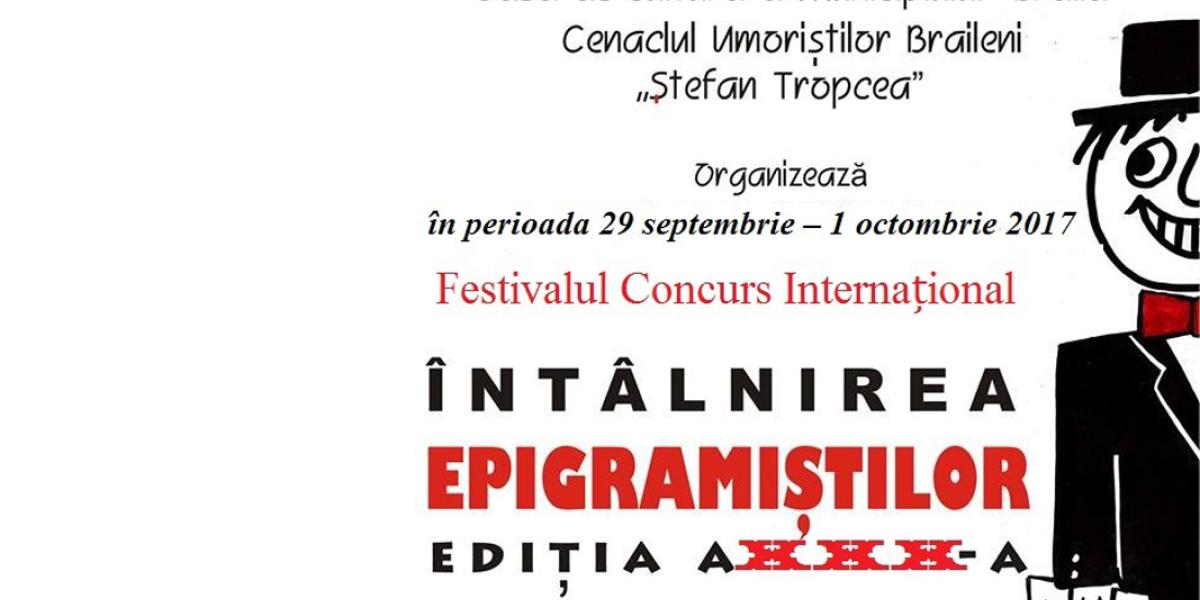 În perioada 29 septembrie – 1 octombrie 2017, la Brăila va avea loc cea de a XXX-a ediţie a Festivalului Concurs Internaţional Întâlnirea Epigramiştilor, manifestare organizată de Casa de Cultură a Municipiului Brăila, în colaborare cu Cenaclul Umoriştilor Brăileni (C.U.B.) Ştefan Tropcea.