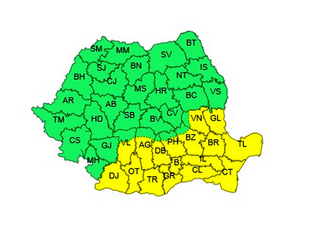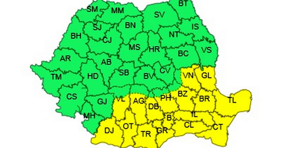 Vizate de atenţionarea cod galben ANM sunt Capitala şi judeţele: Prahova, Dâmboviţa, Argeş, Vâlcea, Dolj, Vrancea, Galaţi, Buzău, Brăila, Tulcea, Ialomiţa, Constanţa, Călăraşi, Giurgiu, Teleorman şi Olt.