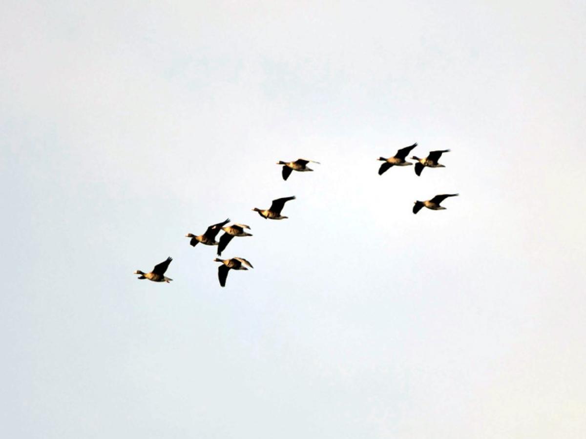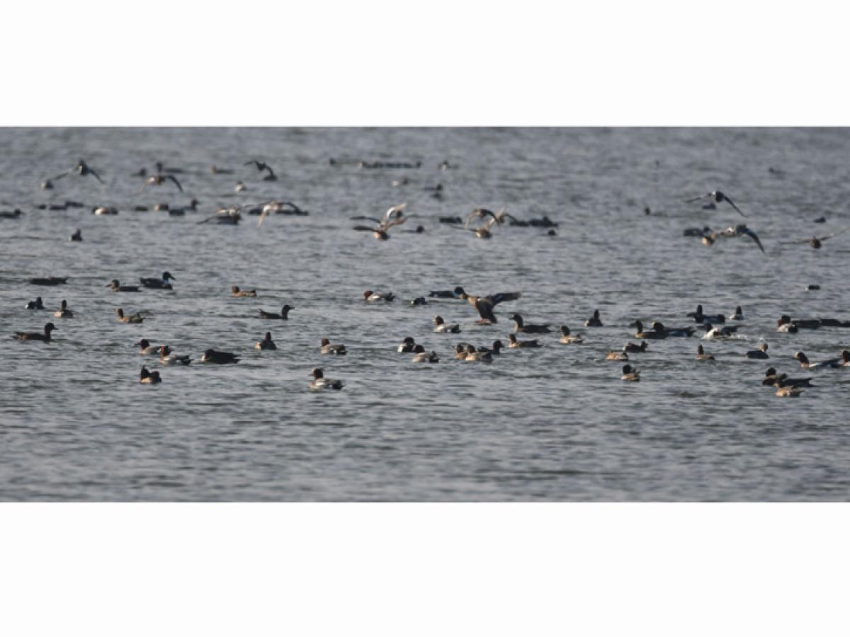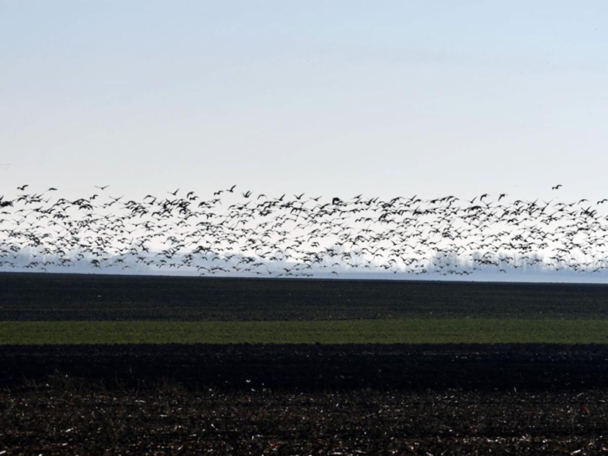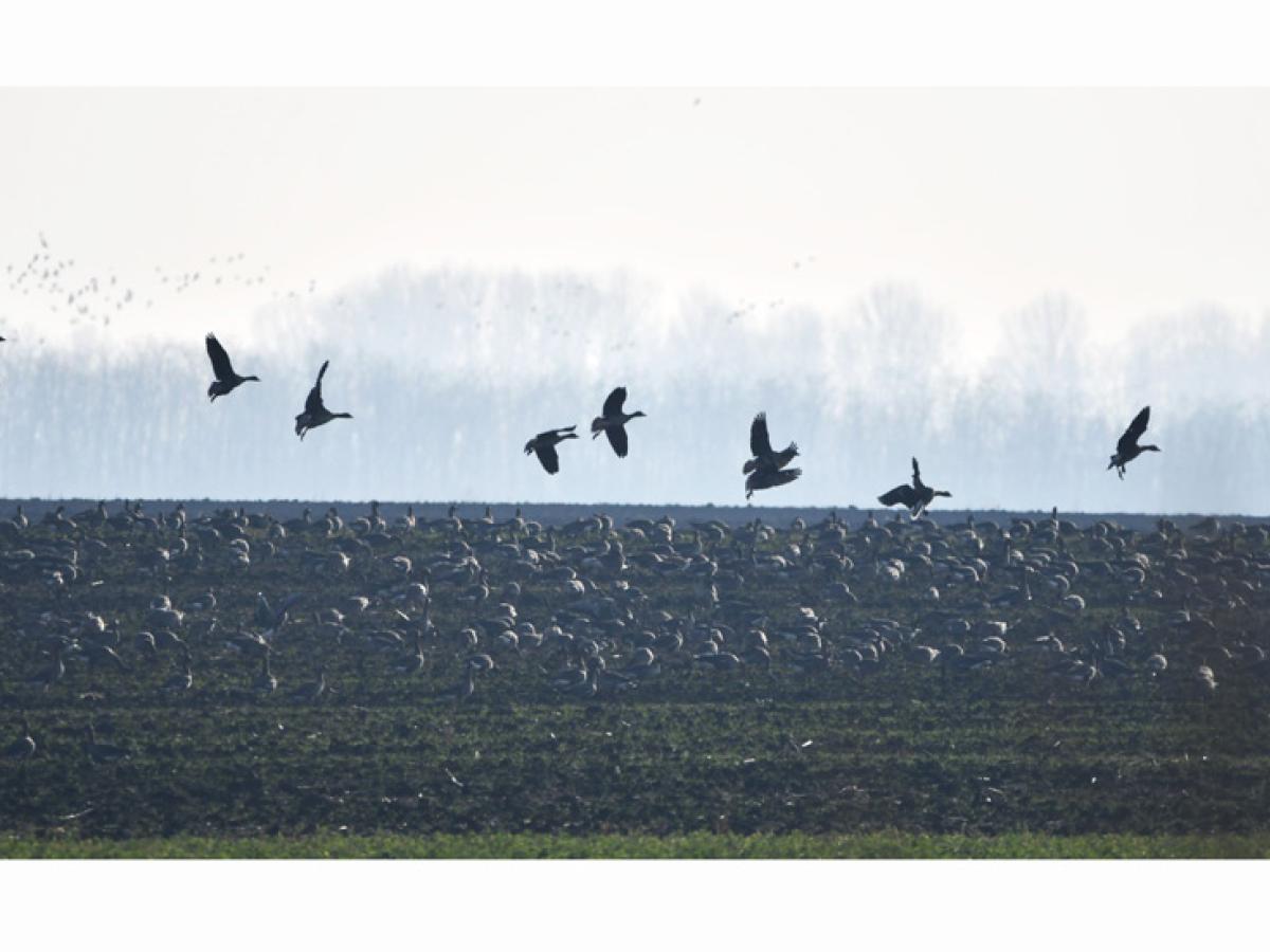 Având o experiență de 25 de ani de teren, atunci când ajung într-o zonă ca aceasta, devin foarte atent. Așa am făcut și acum și norocul ne-a surâs. Am auzit nu departe găgăit de gâște și după câteva cadre trase cu aparatul foto la baltă am plecat pe câmp spre locul de unde se auzea destul de tare zarva făcută de gărlițe. Am reușit să ne apropiem și să vedem la masă, pe câmp, undeva la 1.500 de gârlițe mari. Puteau fi și alte specii în acele aglomerări de păsări dar nu am avut noroc să le identificăm din cauza faptului că soarele strălucea din față și ne îngreuna identificarea. Am plecat, plini de noroi, spre Lacu Sărat, un loc pe unde trecusem la dus și unde zărisem din goana mașinii multe păsări.