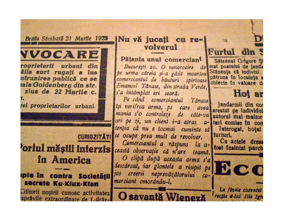 Presa vremii a consemnat şi cazuri mai puţin plăcute în care erau implicaţi posesorii de arme de foc: sinucideri şi accidente regretabile, care au ţinut prima pagină a ziarelor din perioada interbelică. Sub titlul “Nu vă jucaţi cu revolverul. Păţania unui comerciant”, ziarul Curierul, despre care am amintit mai sus, consemna: “O nenorocire de pe urma căreia şi-a găsit moartea comerciantul de băuturi spirtoase Emanoel Tănase, din strada Verde, s-a întâmplat ieri seară. Pe când comerciantul Tănase îşi verifica arma - pe care avea mania s-o controleze de câteva ori pe zi - un client i-a atras atenţia că nu e tocmai cuminte să se ocupe prea mult de revolver. Comerciantul i-a răspuns că n-are teamă. O clipă după aceasta, arma s-a descărcat (!) iar glontele a risipit pe jos creierii neprevăzătorului comerciant, omorându-l”. (Curierul, Brăila, sâmbătă, 21 martie 1925).