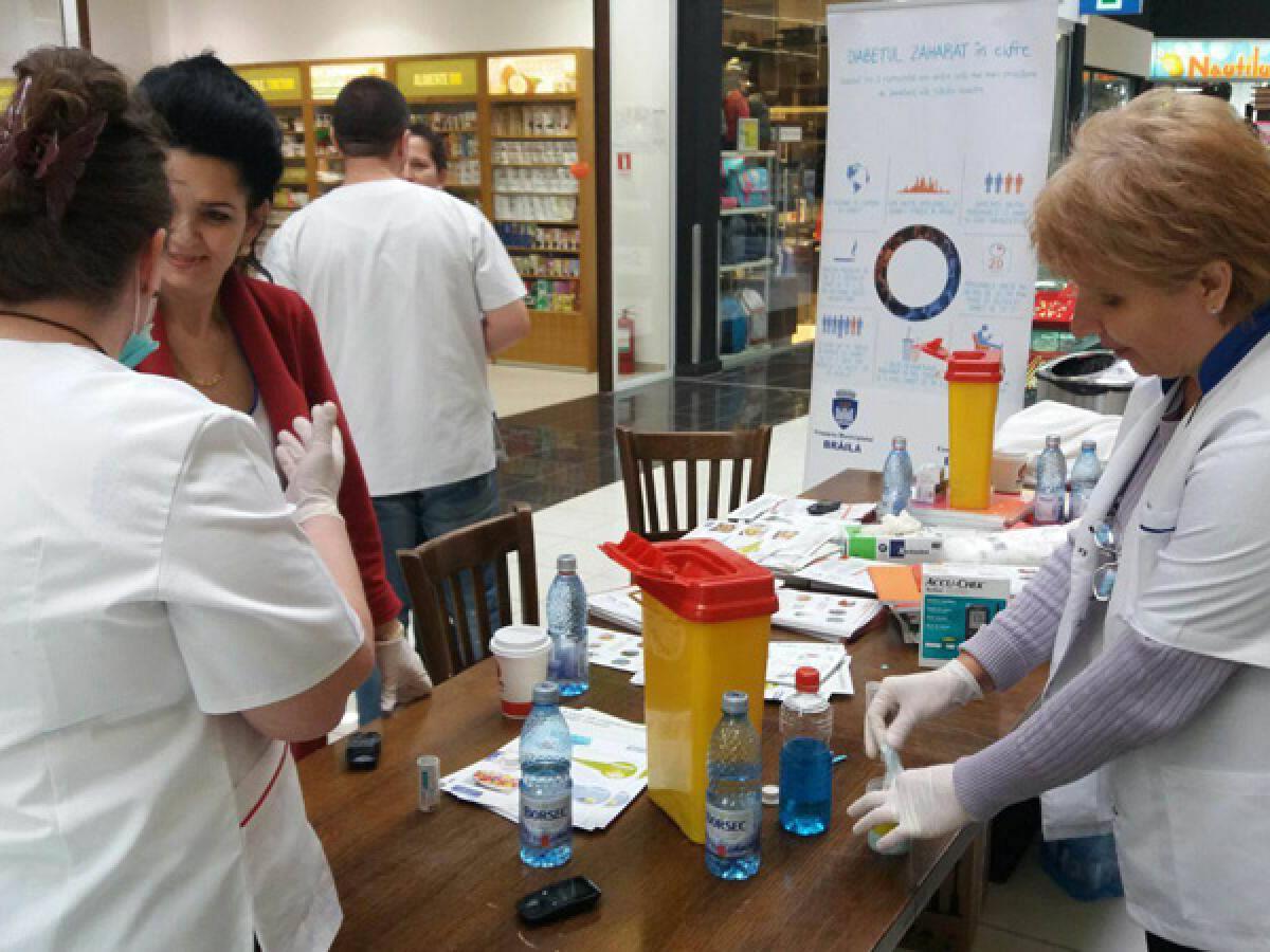 Persoanele care au fost ieri în mallul brăilean şi-au putut testa glicemia, fără a scoate vreun ban din buzunar, iar rezultatul l-au primit pe loc, în câteva secunde. Evenimentul a fost organizat cu ocazia Zilei Mondiale a Diabetului, de către medicul specialist pe diabet, nutriţie şi boli metabolice Cristina Voineag, din cadrul Spitalului Judeţean de Urgenţă Brăila. Standul a fost amplasat încă de la ora 10.00, iar în jurul orei 11.00, aproape 100 de oameni au acceptat să-şi măsoare glicemia. Activitatea s-a încheiat seara, la ora 20.00.