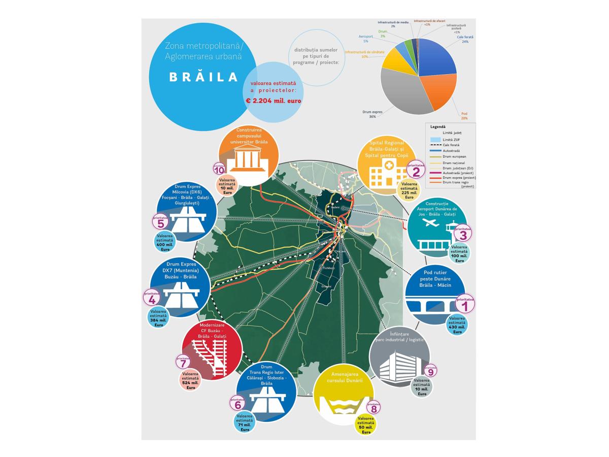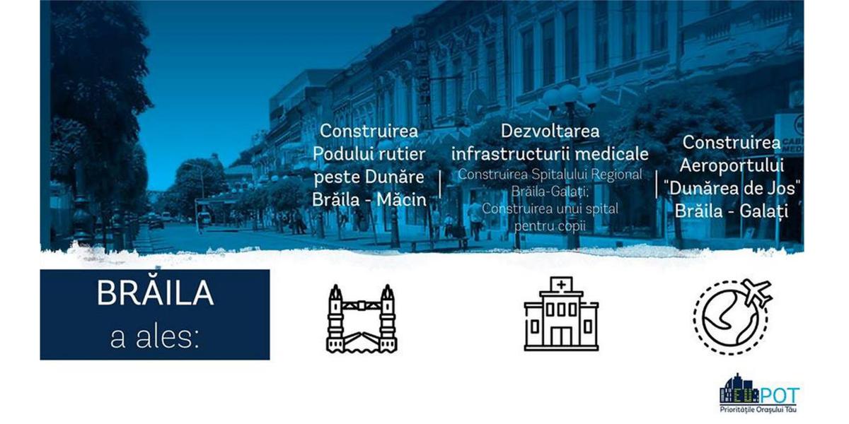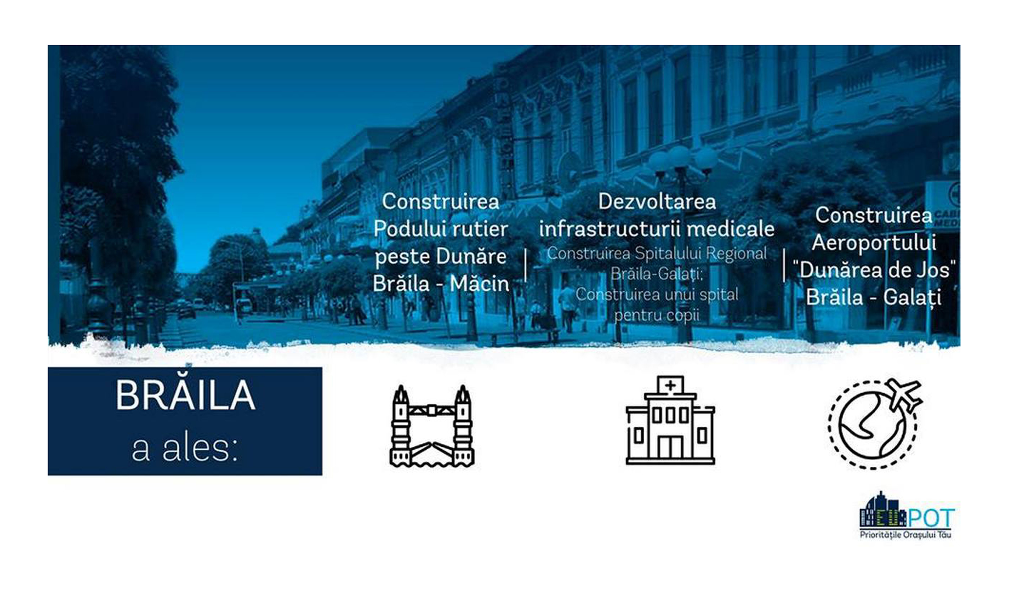 • este vorba despre rezultatul campaniei “Alege Priorităţile Oraşului Tău”, realizată de Banca Mondială, în parteneriat cu Federaţia Zonelor Metropolitane şi Aglomerărilor Urbane din România, dar şi cu sprijinul autorităţilor locale • brăilenii au fost invitaţi să aleagă, până pe 22 martie, ordinea a 10 proiecte indicate de autorităţile locale ca fiind importante pentru comunitate • potrivit rezultatelor publicate de organizatori, pe locul 1 între opţiunile brăilenilor se situează Podul peste Dunăre, urmat pe 2 de Spitalul Regional şi pe 3 de Aeroportul “Dunărea de Jos” • topul galaţenilor începe cu proiectul: Conectarea la A2 prin Drumul Expres DN21 Brăila-Slobozia