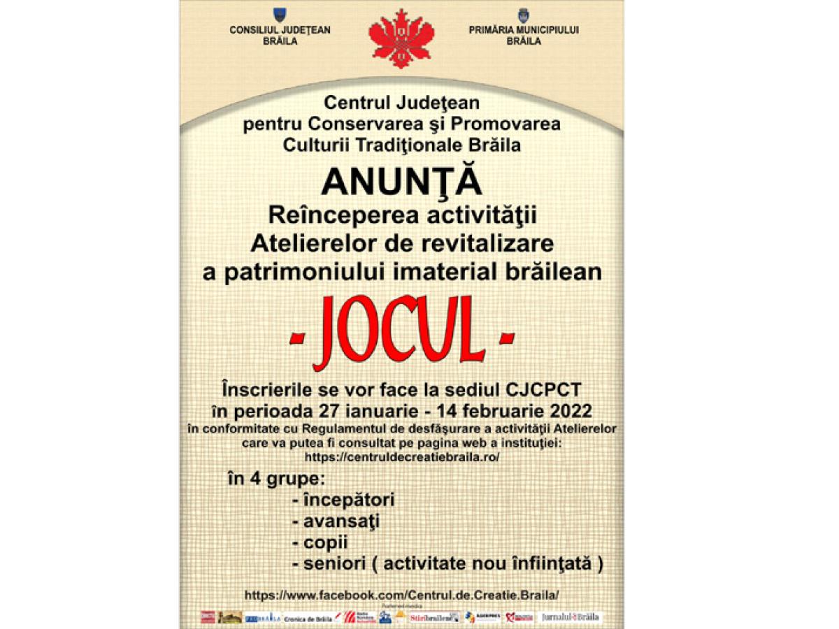 Astfel, Consiliul Județean Brăila, Primăria Municipiului și Centrul Județean pentru Conservarea și Promovarea Culturii Tradiționale Brăila (CJCPCT - Centrul de Creație) anunță reluarea activității Atelierelor de revitalizare a patrimoniului imaterial brăilean. Mai precis, este vorba de reluarea activității Atelierului "Jocul", înscrierile începute la finele lunii ianuarie a.c. fiind prelungite până pe data de 14 februarie. Doritorii se pot adresa secretariatului Centrului de Creație Brăila (din Piața Traian nr. 2) consultând, totodată, Regulamentul de desfășurare a activității Atelierelor pe pagina web a instituției: https://centruldecreatiebraila.ro/.
