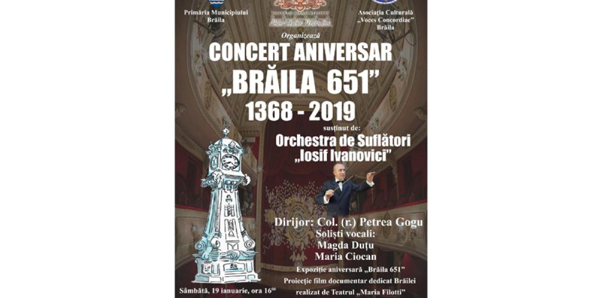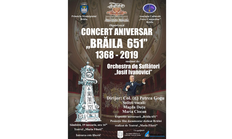 Weekendul acesta, oraşul este în sărbătoare! Sâmbătă, 19 ianuarie, brăilenii sunt invitaţi la o serie de evenimente dedicate împlinirii a 651 de ani de atestare documentară a Brăilei. Locul unde se vor desfăşura acestea este Teatrul “Maria Filotti”, începând cu ora 16.00. Astfel, cei care vor veni vor putea admira o Expoziţie de ilustrate şi documente puse la dispoziţie de Serviciul Judeţean al Arhivelor Naţionale Brăila şi Biblioteca Judeţeană “Panait Istrati”. Participanţii au ocazia să vadă şi un film documentar realizat de Teatrul “Maria Filotti” Brăila, cu sprijinul Muzeului Brăilei “Carol I”- “Brăila - Misiune pentru România”, regia şi scenariul Anca Cismaru, ilustraţia muzicală Ştefan Cudălbeanu. Seara se va încheia cu un Concert Aniversar susţinut de Orchestra de Suflători “Iosif Ivanovici”, dirijor Col(R) Petrea Gogu, solişti vocali Magda Duţu şi Maria Ciocan.