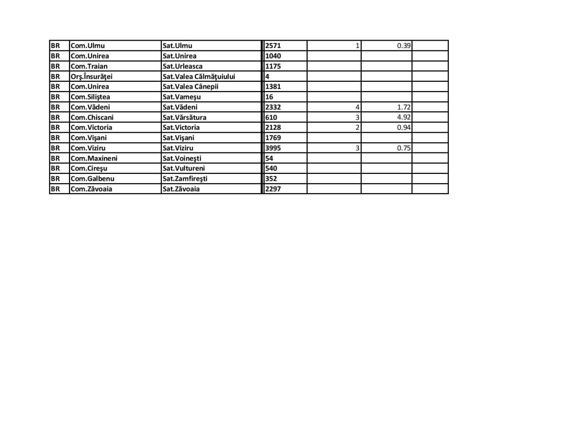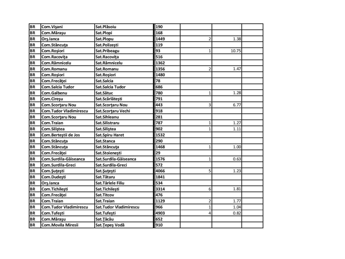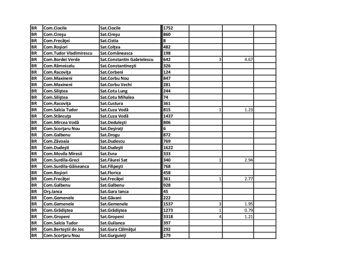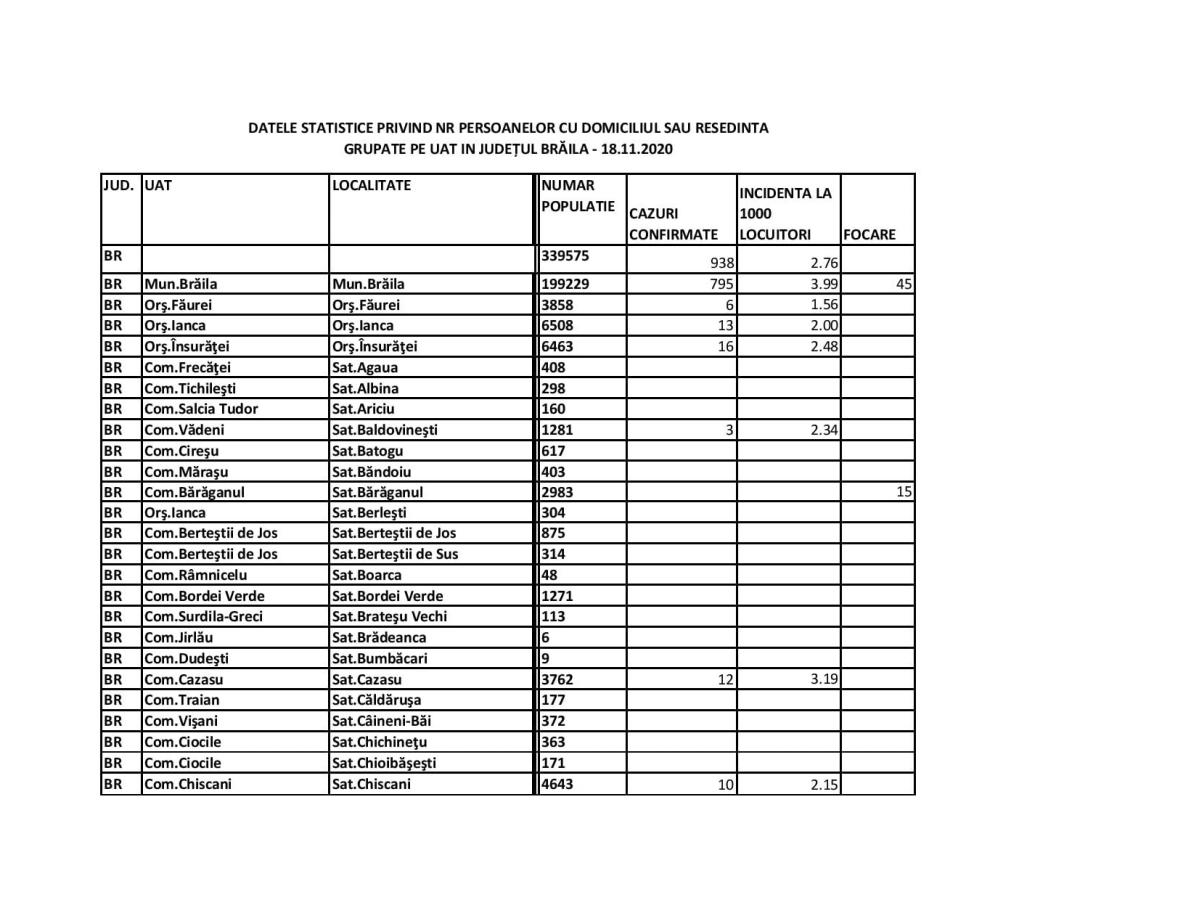 Pe pagina de Facebook a Prefecturii Brăila a fost publicată situația la zi, astfel că pe lângă cele amintite de subprefect, trebuie precizat că și în satul Mihai Kogălniceanu (comuna Râmnicelu) incidența este de 10,15, cu două cazuri confirmate.