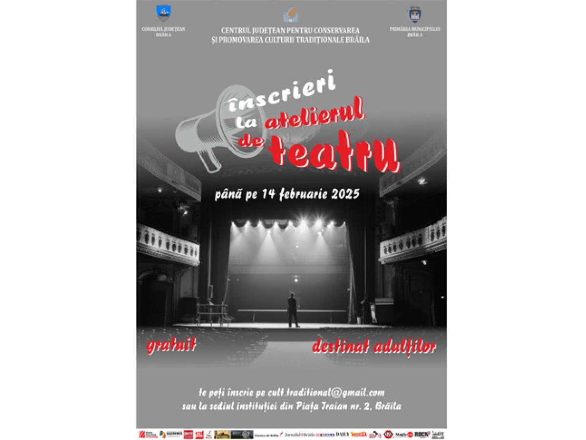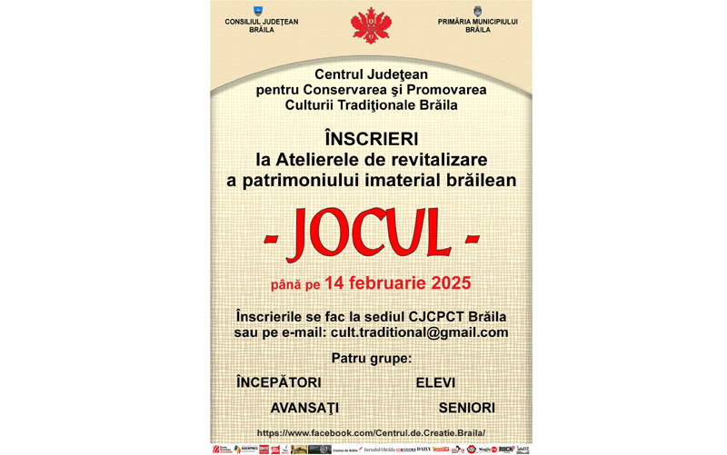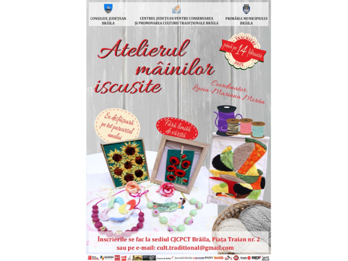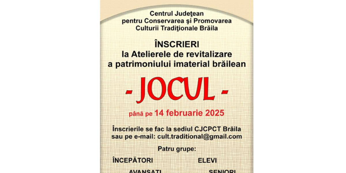 Este vorba de Atelierele de revitalizare a patrimoniul imaterial „Jocul”, Atelierul „Mens sana in corpore sano”, Atelierul Mâinilor Iscusite, Corala Camerata, Atelierul coral pentru copii „Vox et versus”, Atelierul de inițiere în arta dansului - Tango, Grupul vocal „Dunărencele” și, nu în ultimul rând, Atelierul de teatru pentru amatori. Toți cei interesați se pot înscrie la unul dintre atelierele organizate de instituție atât online, pe adresa cult.traditional@gmail.com, cât și direct la sediul Centrului Judetean pentru Conservarea si Promovarea Culturii Traditionale Brăila, din Piața Traian nr. 2. Termenul limită pentru înscrieri este 14 februarie. Potrivit organizatorilor, atelierele sunt gratuite și se adresează tuturor membrilor comunității.