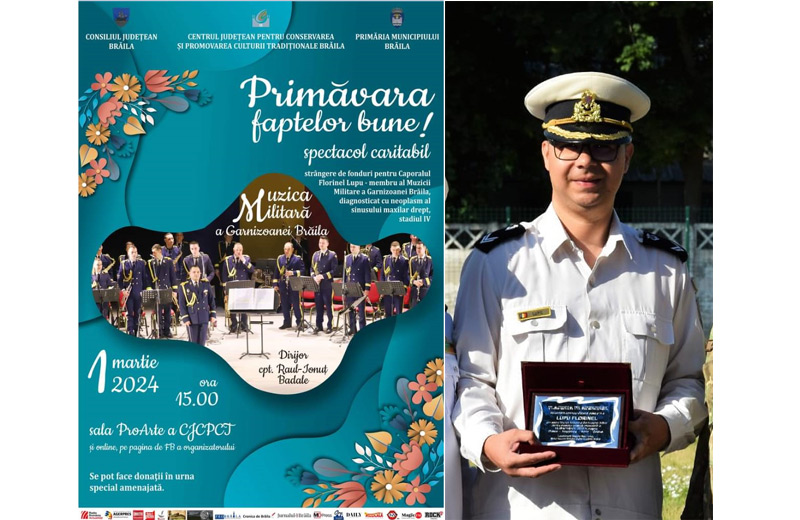 Spectacol caritabil susținut de membrii Muzicii Militare a Garnizoanei Brăila, condusă de cpt. Raul Ionuț Badale, pentru colegul lor, caporal Florinel Lupu, diagnosticat cu o afecțiune deosebit de gravă. Florinel urmează se se trateze la o clinică din străinătate și are nevoie de sprijinul nostru, al tuturor.